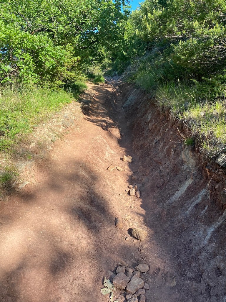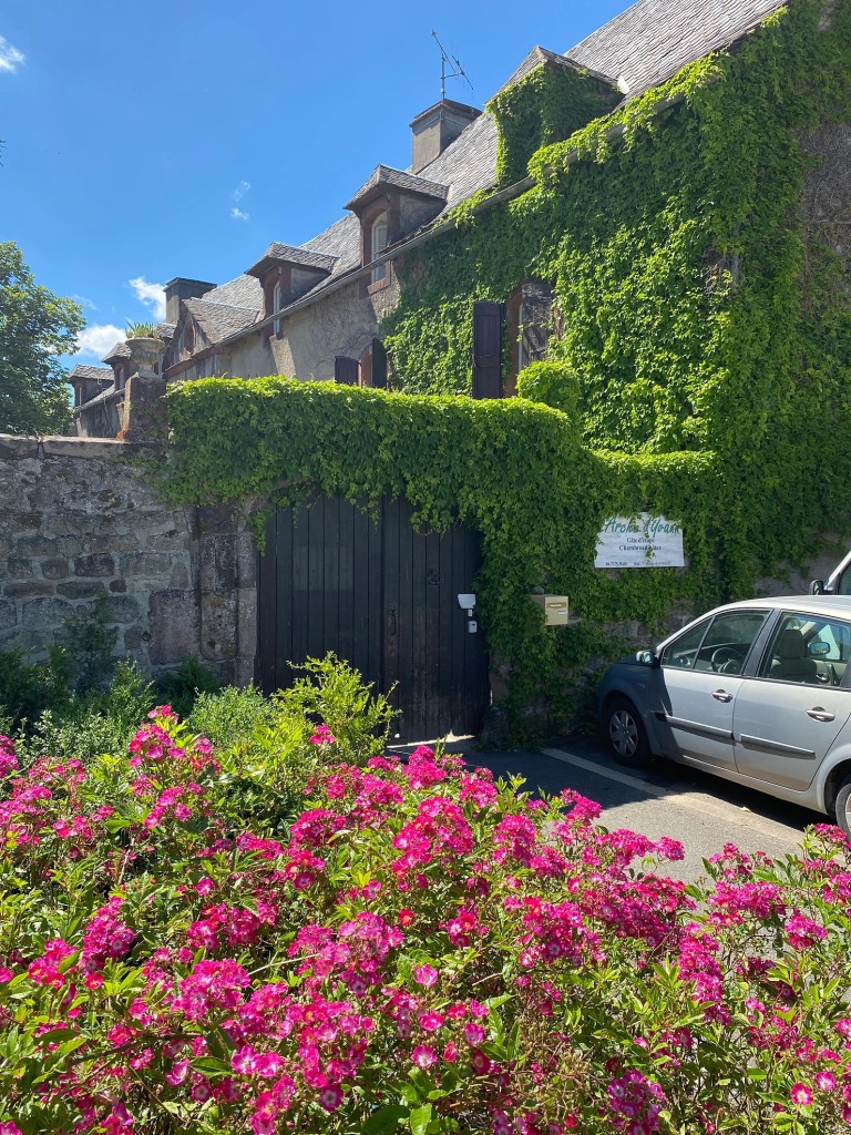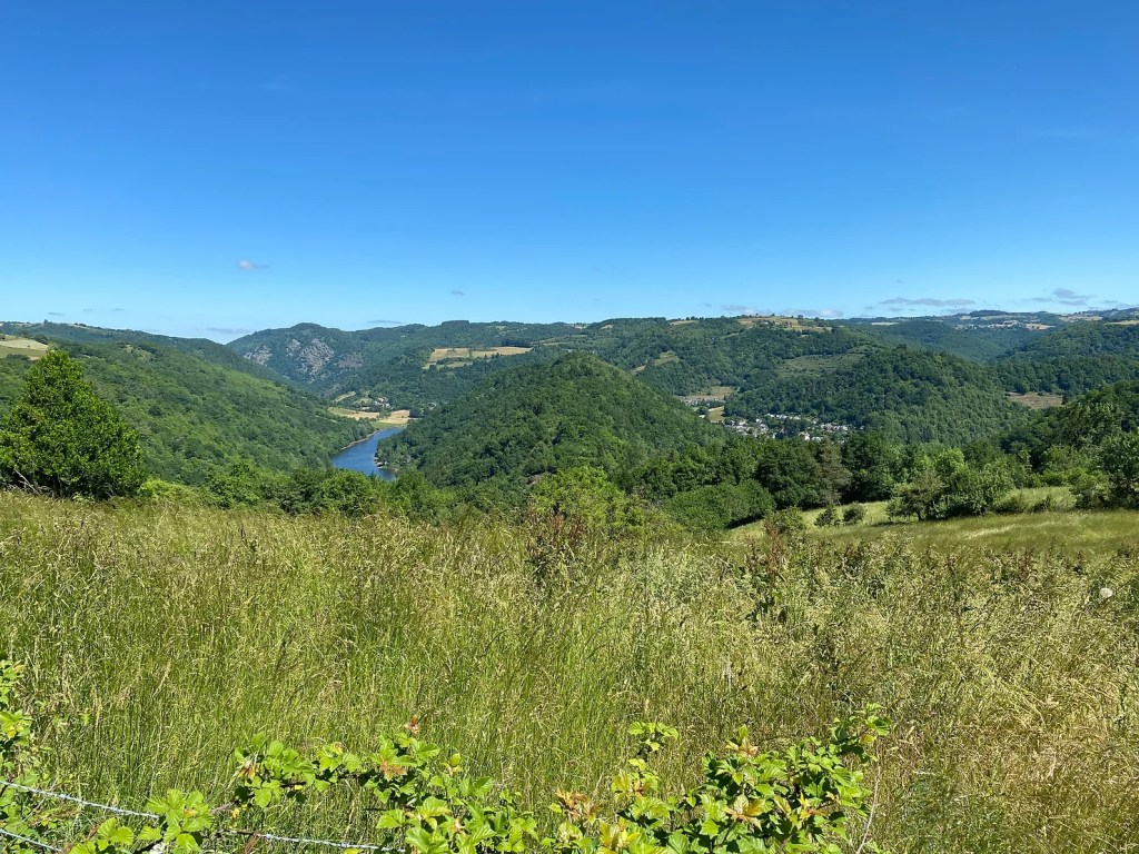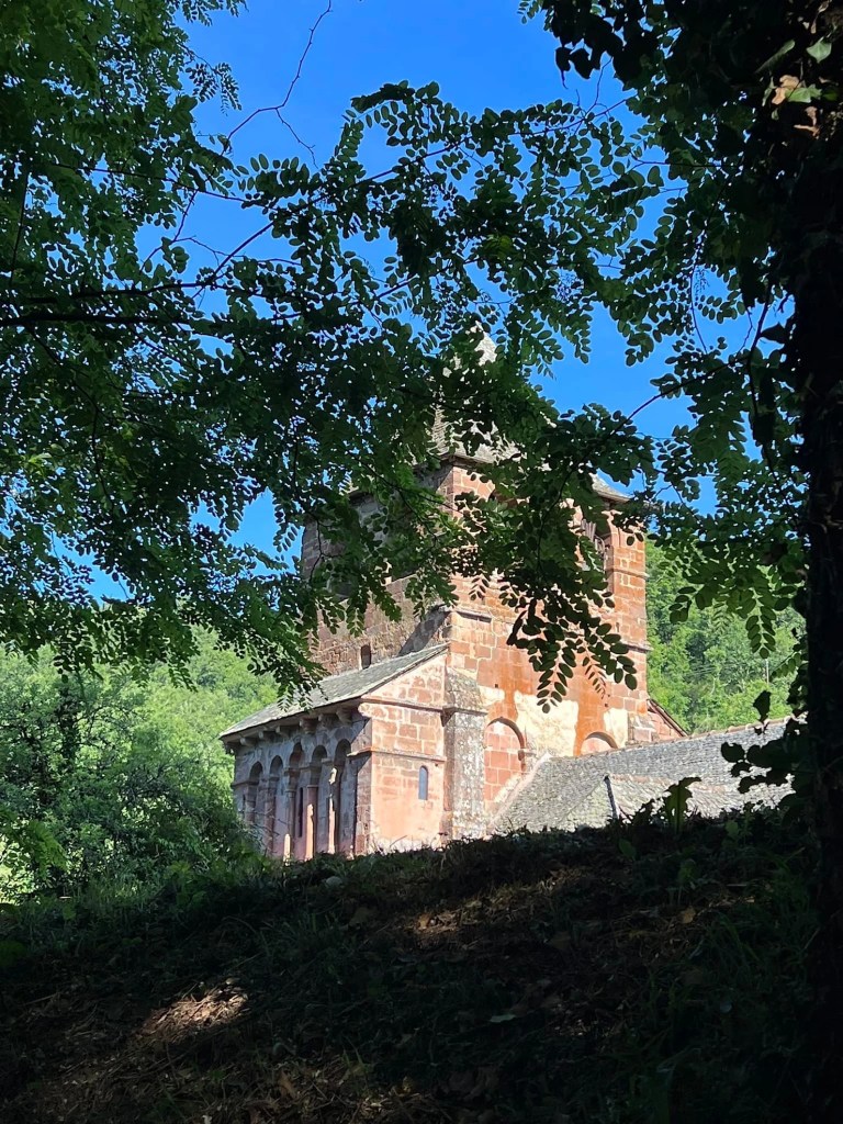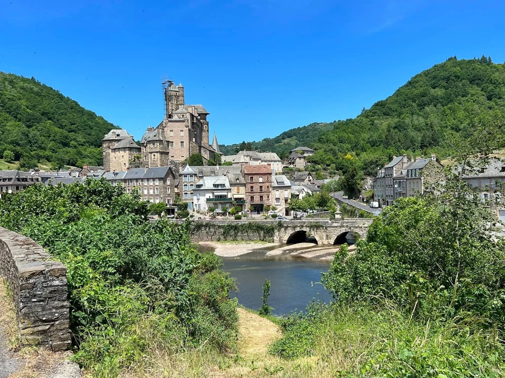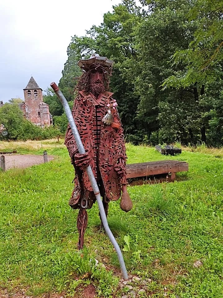 Vendredi 27 mai, je fais le choix de passer par la voie historique (GR6) pour rallier Campuac ; moins de route, plus de chemins. Je gagne rapidement Saint-Pierre de Béssuéjouls, une ancienne seigneurie, où un pèlerin de fer garde les lieux. Voilà la bosse de la journée, et celle-là elle en vaut la peine. J’entame ensuite la descente vers le beau village d’Estaing. Je grimpe sur une crête par un petit sentier escarpé. La vue sur le méandre du Lot et Estaing est superbe. Après ma pause sandwich, je trace ma route, le tronçon se passe en forêt. Je monte et descends plusieurs combes, enchaînant les dénivelés. J’arrive éreinté à Campuac, Yvann m’accueille dans son arche.