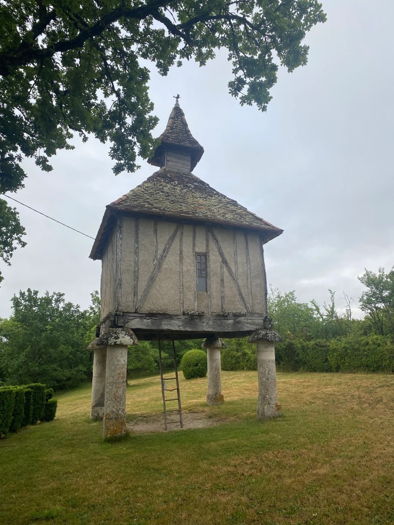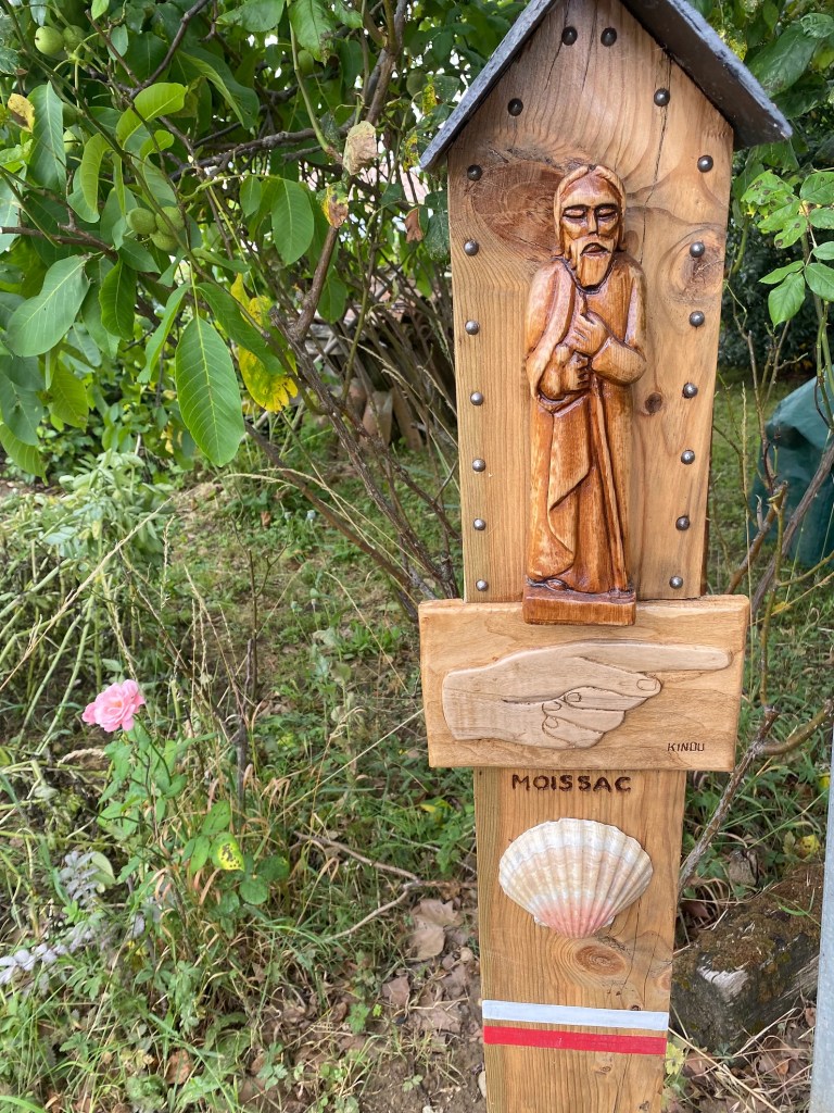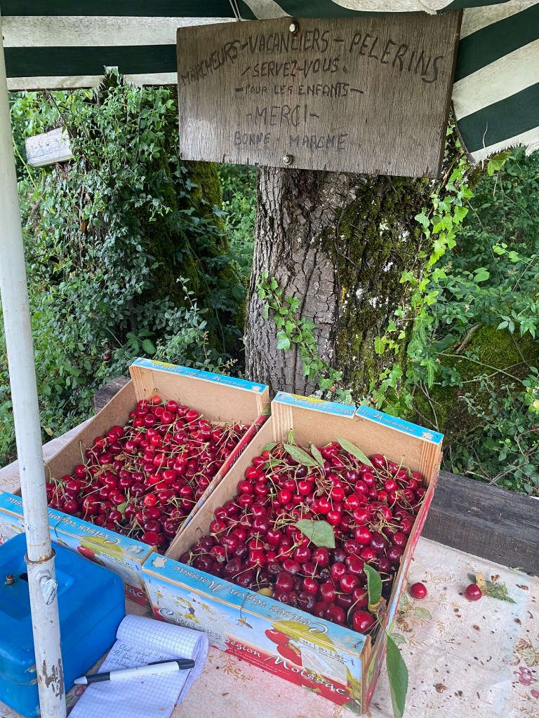 Samedi 4 juin, le petit déjeuner est prêt il y a tout ce qu’il faut pour un bon départ sur le chemin. Lorsque je quitte le gîte, une épaisse brume enserre la colline fortifiée de Lauzerte. Pour suivre le tracé blanc et rouge, je remonte vers le centre encore endormi. La vue sur la mer de brouillard est douce et apaisante. Le chemin m’amène brièvement vers la large vallée de la Barguelonne où je dois marcher sur du goudron. Je découvre un très beau pigeonnier. Il n’y a strictement plus aucun pèlerin en vue. A l’approche d’un verger, un cultivateur a mis ici un stand avec des plateaux de fruits cueillis. Il s’agit d’un donativo (chacun peut mettre le montant qu’il souhaite) au profit des enfants. J’y déguste quelques délicieuses cerises. Afin d’éviter l’horrible entrée dans Moissac, j’emprunte la variante qui traverse un agréable quartier de villas assez cossues et va m’amener à l’auberge des Chemins. Après une bonne douche, je pars visiter l’abbatiale et son fameux cloître, je ne vais pas être déçus !