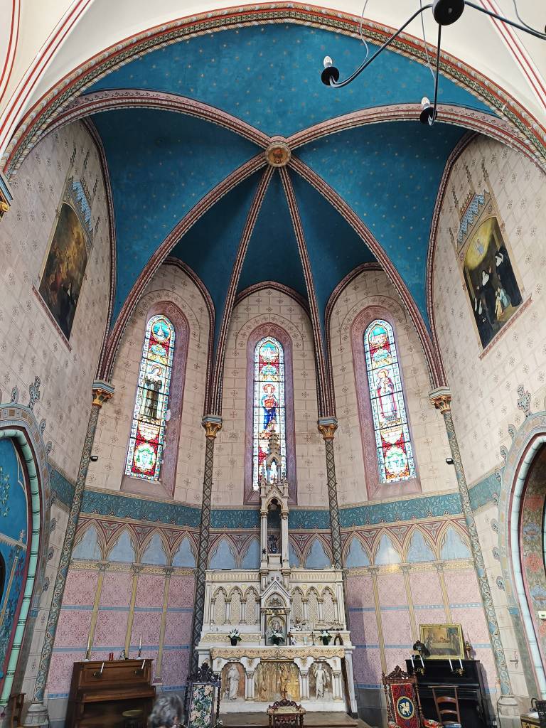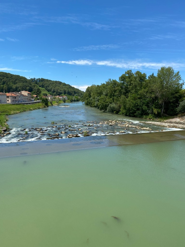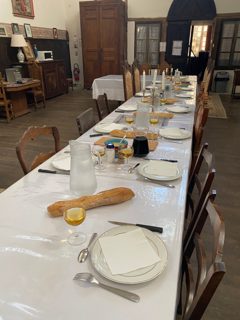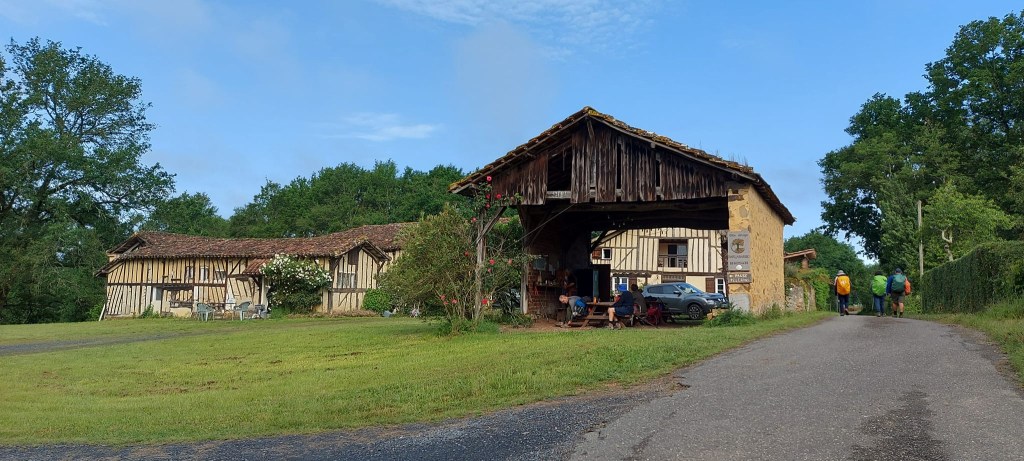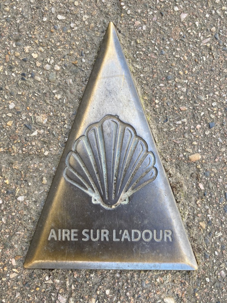 Vendredi 10 juin, je pars requinqué d’un pas résolu vers Aire-sur-l’Adour. Une journée presque entière à sillonner les petites collines du Gers et ses grands champs de maïs qui descendent jusqu’à la grande plaine de l’Adour. Au pays de l’Armagnac, la vigne reste aussi présente. Des kilomètres durant le paysage n’évolue pas, le maïs est partout, dans une morne plaine sans relief, sans mystère, toujours ces insipides champs sans âme. Je fais la connaissance de Marina, cette jeune femme attachante à l’instinct baroudeuse. Délivrance enfin ! je vois le bout de cette étape. Je franchis le pont qui enjambe l’Adour et je me rends sur les hauteurs dans un beau quartier. Je suis impatient de rejoindre mon hébergement insolite la Chapelle des Ursulines. L’esprit des lieux a été préservé fresques, allégories, vitraux, autel, peintures d’origine. Cette chapelle désacralisée est constituée d’un choeur, une nef où je dînerai sur cette grande tablée, une sacristie transformée en une grande chambre de 7 lits où je dormirai. Un moment unique sur mon chemin.