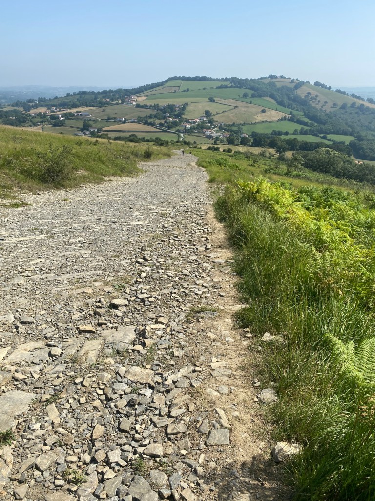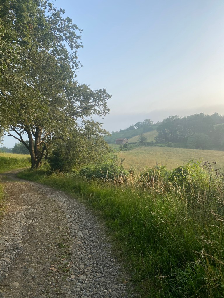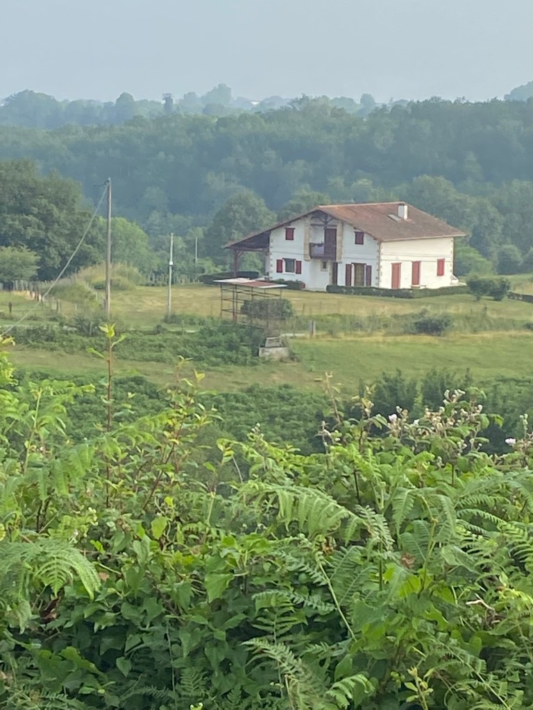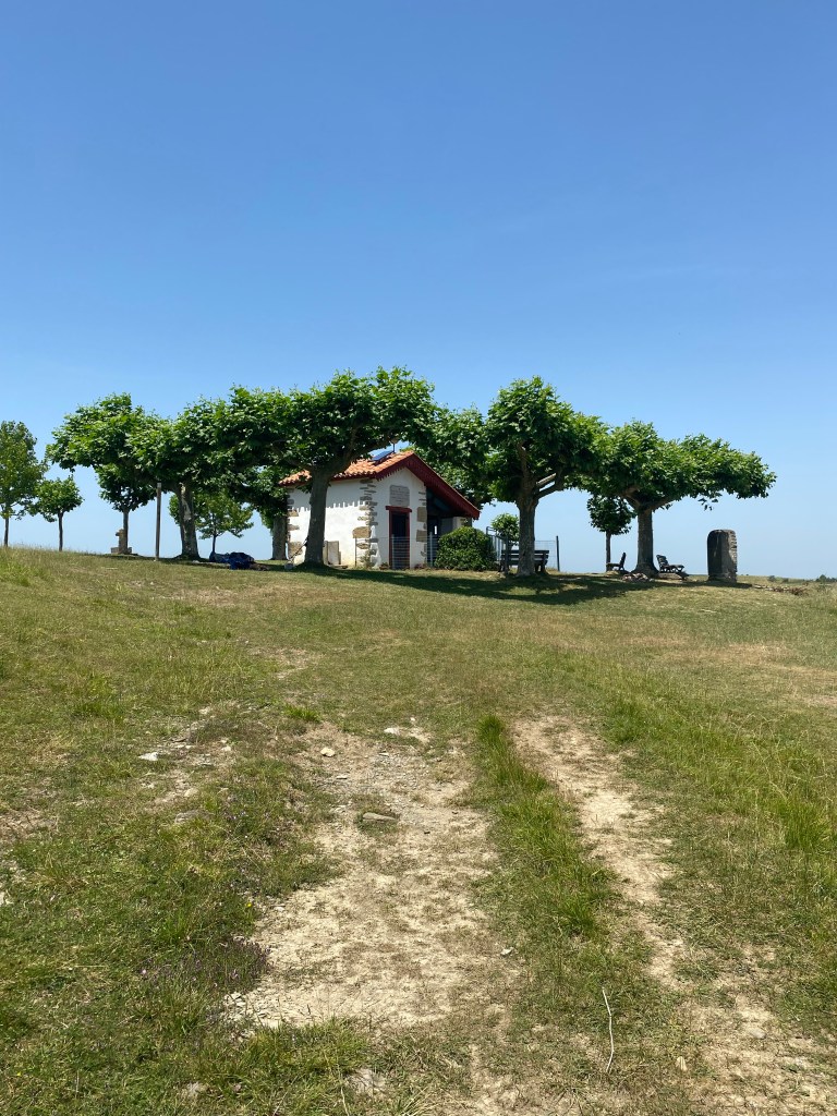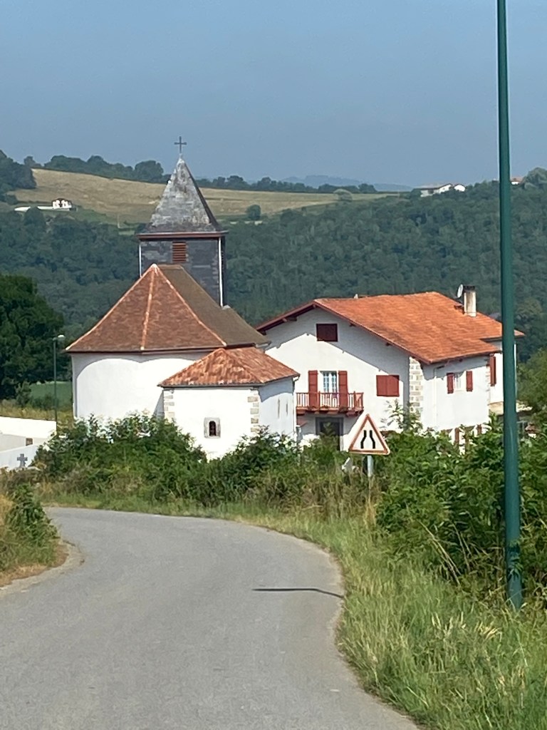 Mercredi 15 juin, c’est mon avant dernière étape (24 km) sur la voie du Puy. Dès le départ, les côtes font leurs apparitions jusqu’en fin de journée. Les vues panoramiques se multiplient et les fermes apparaissent entourées de pâtures. Un troupeau de moutons m’escorte sur plusieurs centaines de mètres. C’est sans doute l’étape la plus physique de ces derniers jours tant par ses montées et ses descentes, ce qui est, somme toute, logique lorsque l’on arrive en pays montagneux. Halte devant la stèle de Gibraltar qui symbolise le point de rencontre de trois chemins du Puy, de Vézelay et de Tours. Quelques kilomètres plus loin, j’entame l’ascension sur la draille, ce long chemin rocailleux qui me mène au point culminant de l’étape. Si la montée est raide et fatigante, la vue qu’elle offre depuis le sommet est magnifique. A cet endroit, s’élève un oratoire, la chapelle de Soyarza, entourée d’un collier de platanes. La descente vers le bois d’Ostabat me conduit au gîte Etchetoa. Atmosphère particulière dans cette batisse du 17° siècle, où j’ai tout apprécié.