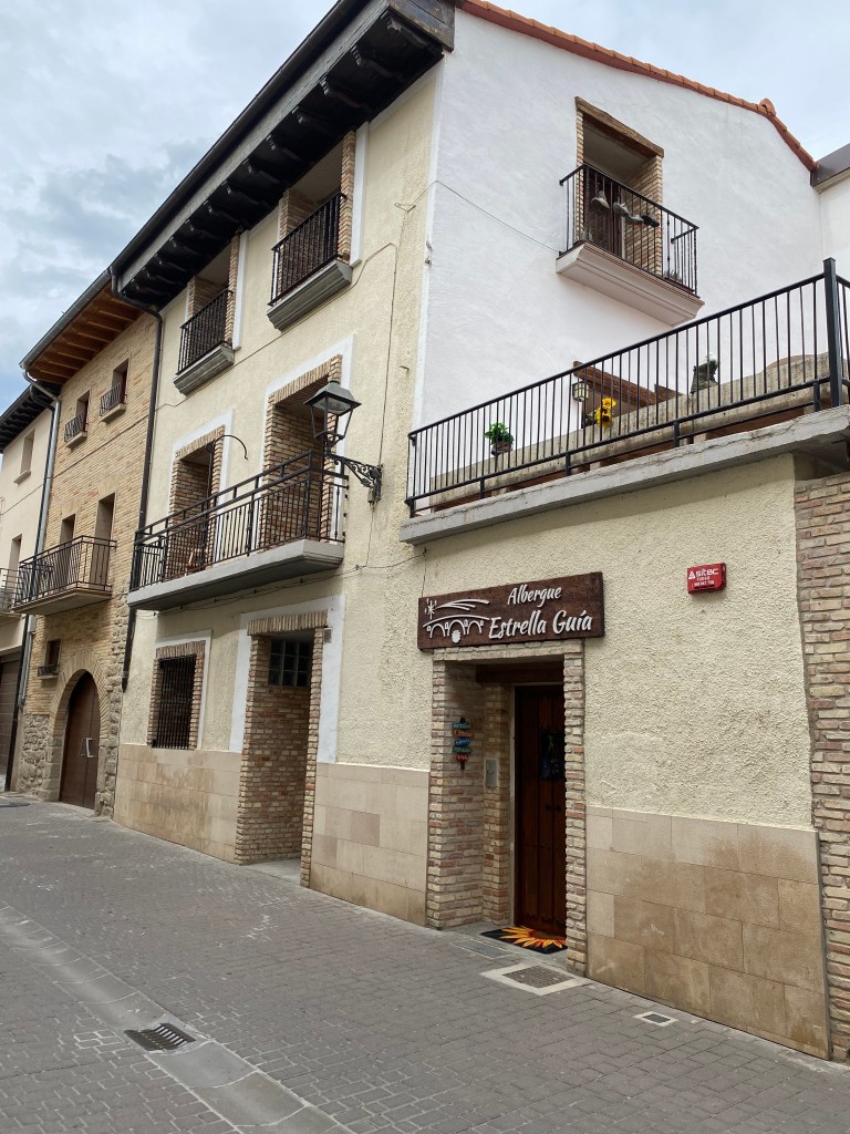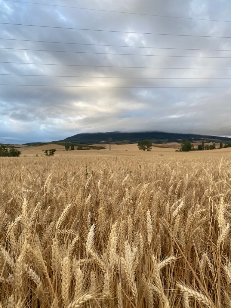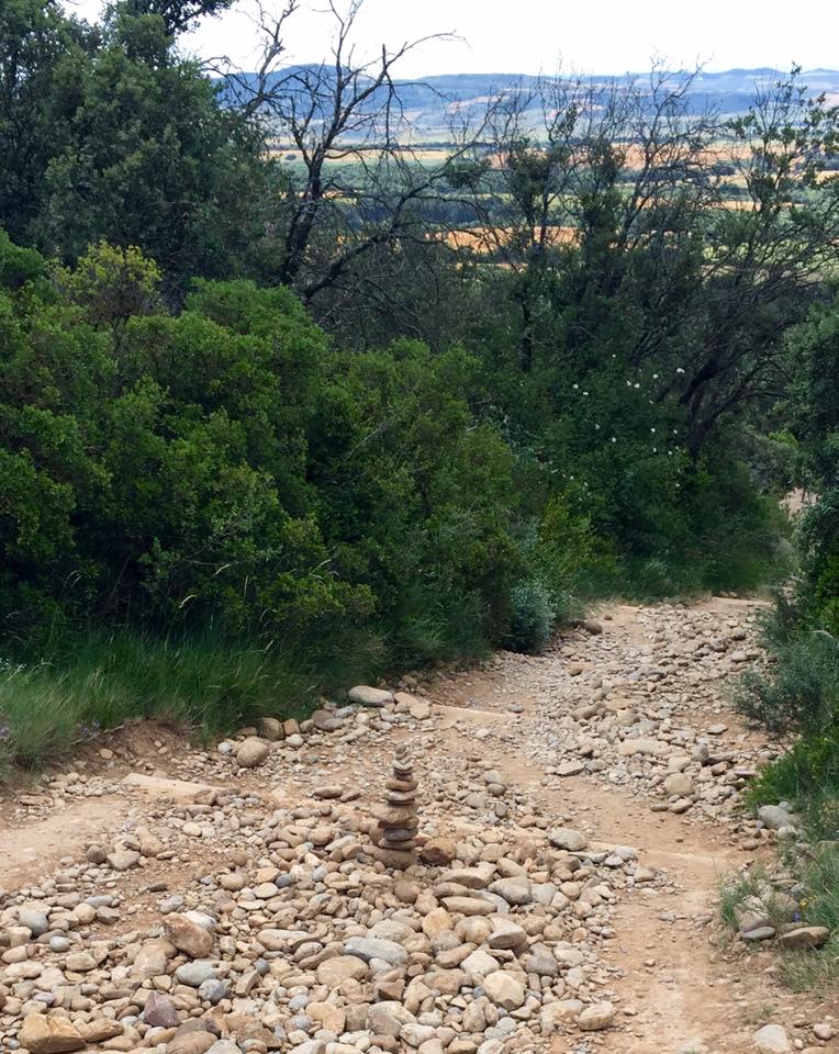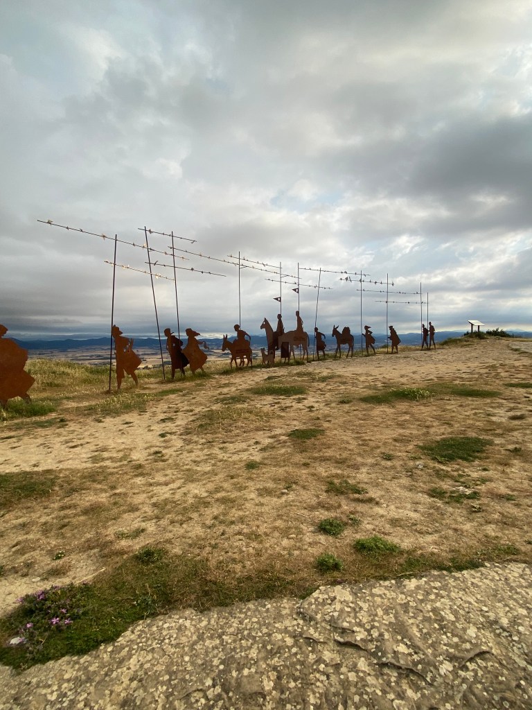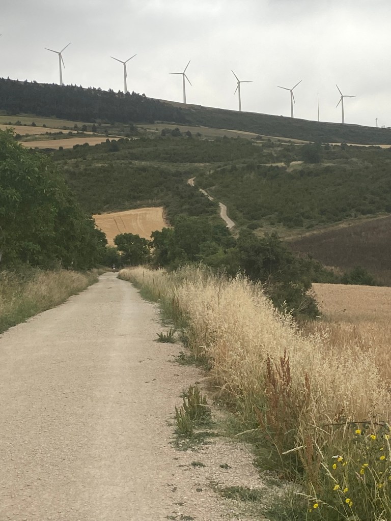 Lundi 20 juin, très tôt je quitte mon hébergement en route pour Puente la Reina. Les coquilles omniprésentes sur les trottoirs, les murs et les panneaux, m’indiquent le chemin à suivre pour sortir de la capitale navarraise. Je me retrouve très vite au milieu des cultures. Ça y’est, c’est vraiment l’Espagne, des sols arides avec ses champs immenses à perte de vue. Au loin, j’aperçois une chaîne de montagnes et son parc éolien. J’entame ma longue ascension pour traverser cette chaîne et suis récompensé arrivé là-haut : l’Alto del Peron (sculpture monumentale en métal), un instant symbolique. Depuis ce promontoire un magnifique panorama s’offre à moi. Il me faut à présent descendre sur l’autre versant passage délicat sur des cailloux roulants sous les chaussures. La vague de chaleur extrême qui touche l’Espagne et le Pays Basque, est la cause des incendies qui se sont déclarés en chaîne dans ce secteur. J’arrive dans le village d’Obanos qui n’a pas été épargné par les flammes. Encore quelques kilomètres à parcourir et à 11 heures j’atteins mon but. Installation dans la confortable albergue Estrella Guïa. Comme à chaque fois, douche, lessive, repos sur le toit terrasse. A disposition une grande cuisine équipée, je mange mon assiette de pâte sur place.