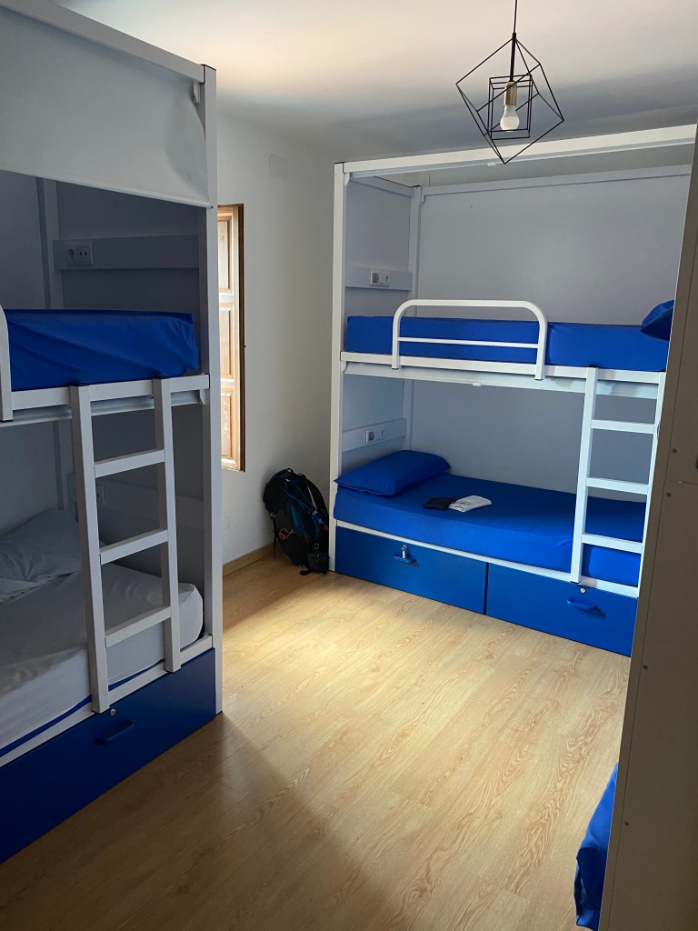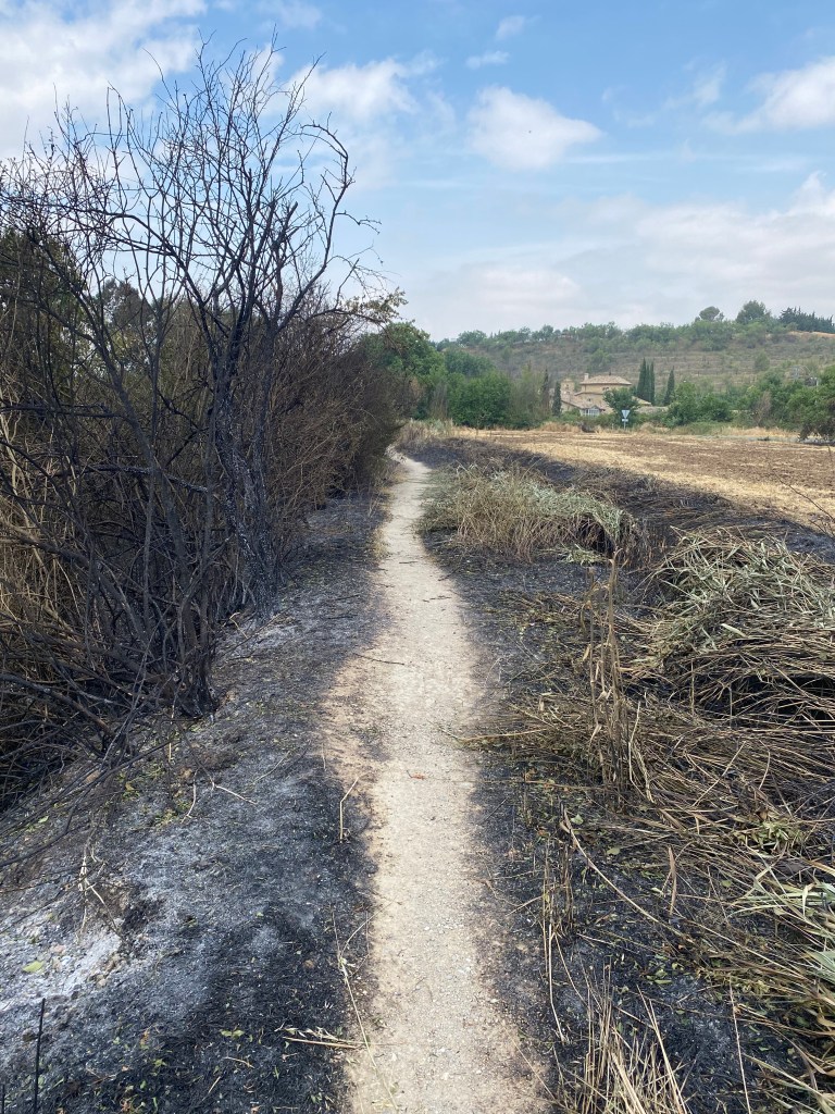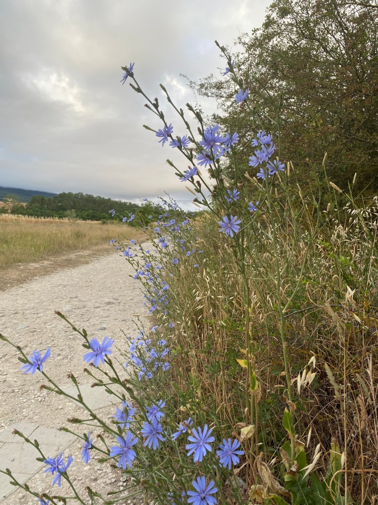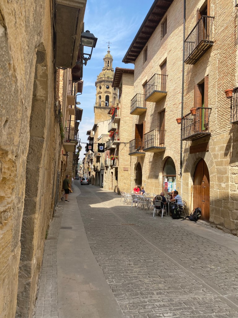 Lundi 20 juin, très tôt je quitte mon hébergement en route pour Puente la Reina. Les coquilles omniprésentes sur les trottoirs, les murs et les panneaux, m’indiquent le chemin à suivre pour sortir de la capitale navarraise. Je me retrouve très vite au milieu des cultures. Ça y’est, c’est vraiment l’Espagne, des sols arides avec ses champs immenses à perte de vue. Au loin, j’aperçois une chaîne de montagnes et son parc éolien. J’entame ma longue ascension pour traverser cette chaîne et suis récompensé arrivé là-haut : l’Alto del Peron (sculpture monumentale en métal), un instant symbolique. Depuis ce promontoire un magnifique panorama s’offre à moi. Il me faut à présent descendre sur l’autre versant passage délicat sur des cailloux roulants sous les chaussures. La vague de chaleur extrême qui touche l’Espagne et le Pays Basque, est la cause des incendies qui se sont déclarés en chaîne dans ce secteur. J’arrive dans le village d’Obanos qui n’a pas été épargné par les flammes. Encore quelques kilomètres à parcourir et à 11 heures j’atteins mon but. Installation dans la confortable albergue Estrella Guïa. Comme à chaque fois, douche, lessive, repos sur le toit terrasse. A disposition une grande cuisine équipée, je mange mon assiette de pâte sur place.