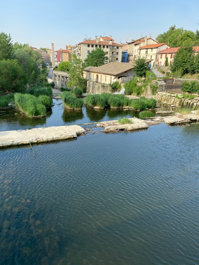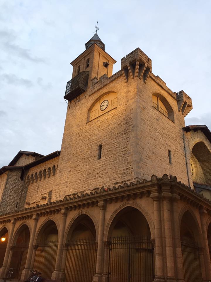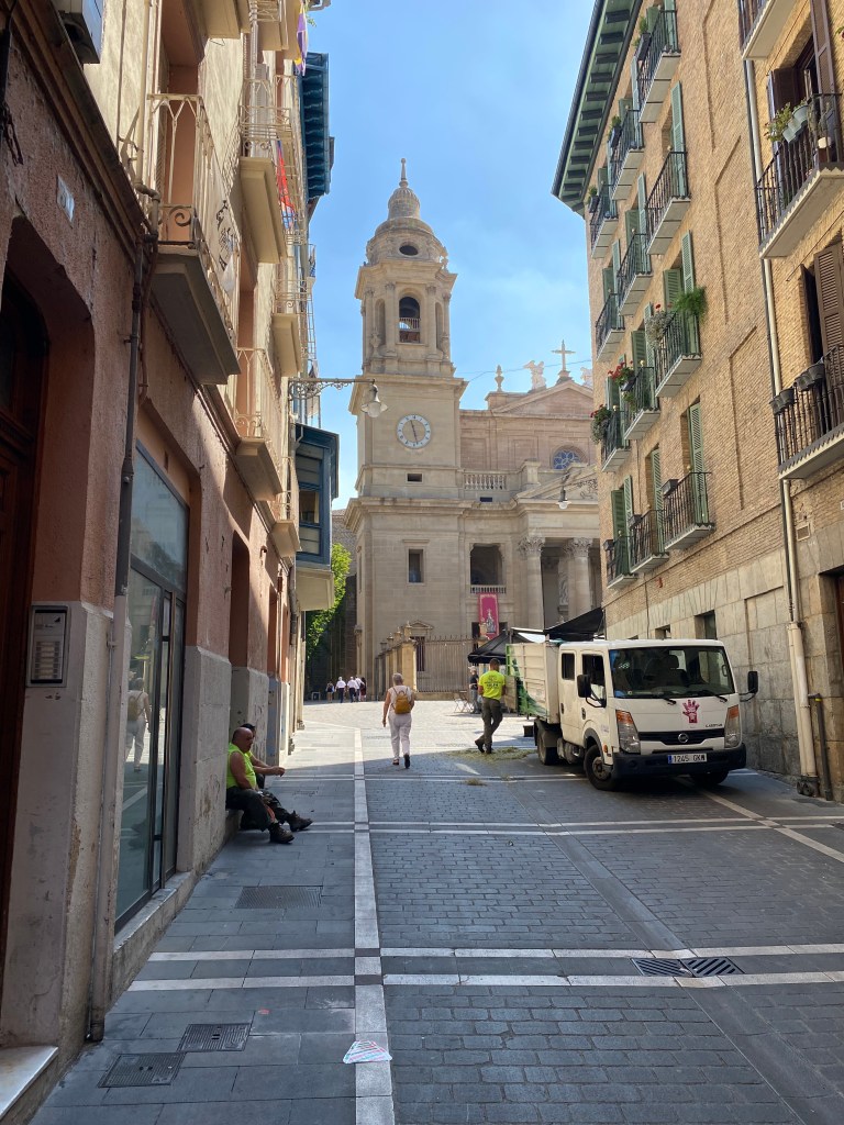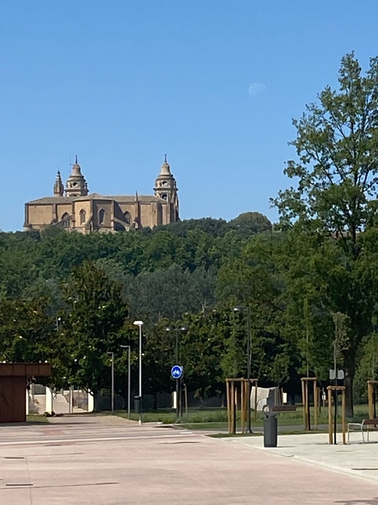 Dimanche 19 juin, je quitte Zubiri pour une nouvelle étape courte de 22 km qui me conduit à Pampelune. Le temps s’annonce très beau, quelques descentes et quelques montées, le tout bien équilibré. Je commence ma journée par un beau tronçon sur les rives de la rivière Arga. Puis s’en vient une partie moins agréable le long d’une gigantesque usine implantée sur une grande partie de la vallée. Heureusement, je m’échappe par un chemin qui monte sur le flanc de colline. La fin de mon itinéraire se poursuit en milieu urbain. J’aborde Pampelune le long des remparts de la vieille ville. Je pénètre dans la forteresse par une porte monumentale. Par des rues étroites, je gagne le centre rapidement. La place de la cathédrale apparaît alors, je suis arrivé. Sous une grosse chaleur, je prends place à l’albergue Plaza Catedral. Petite douche et visite de la cathédrale Sainte Maria et son magnifique cloître. Je prends beaucoup de plaisir à me balader dans cette ville fascinante en état de fête. Comme chaque dimanche, il y a beaucoup de célébration à Pampelune. Je suis baigné dans la foule ce qui me change. A l’heure des tapas, Marina qui achève son chemin ici, m’invite autour d’une délicieuse dégustation dans un bar réputée.
