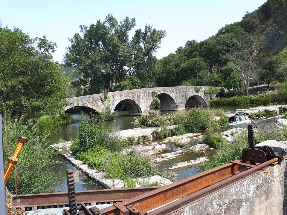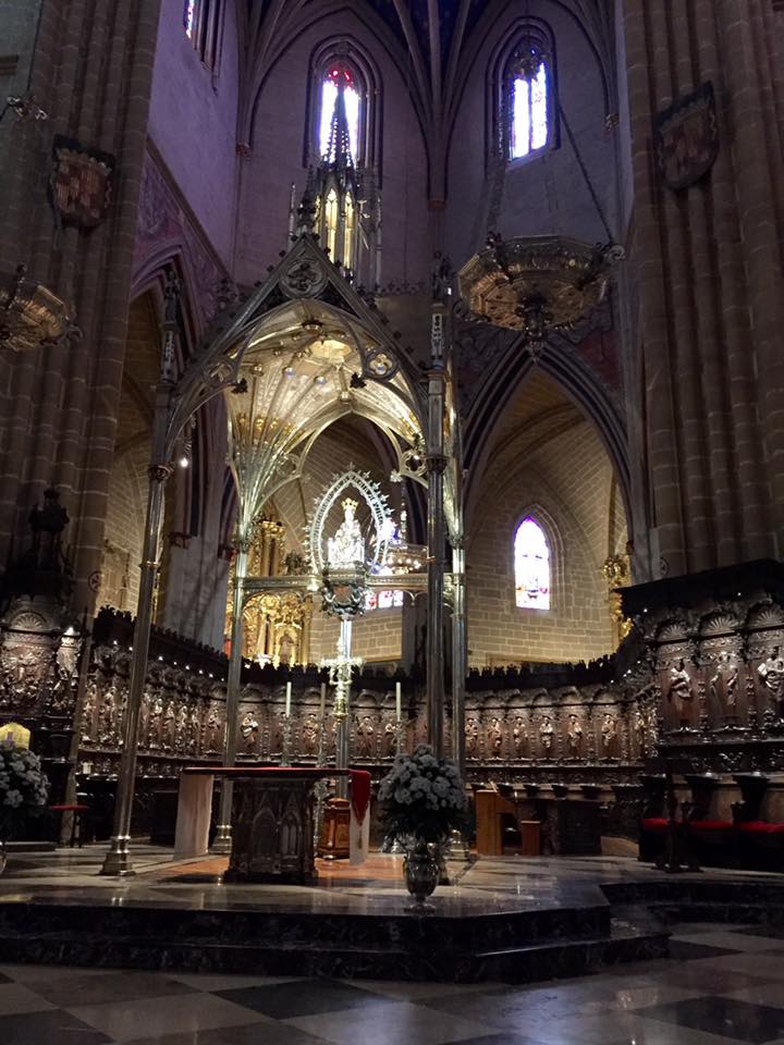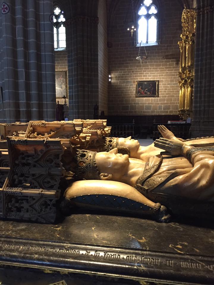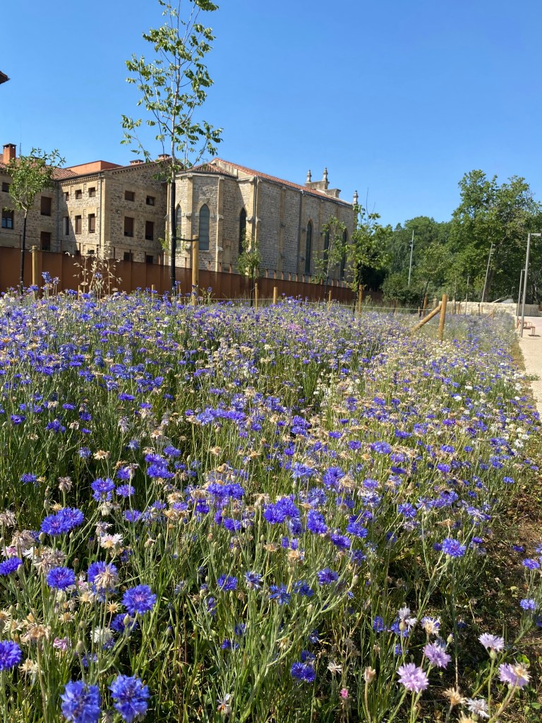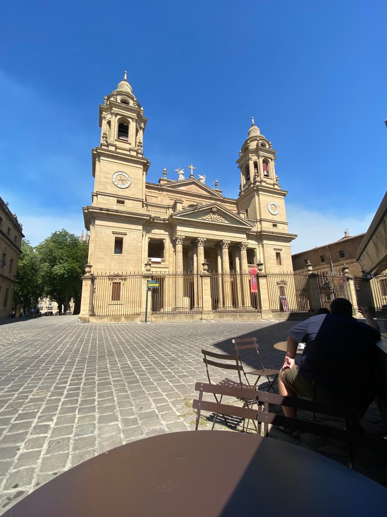 Dimanche 19 juin, je quitte Zubiri pour une nouvelle étape courte de 22 km qui me conduit à Pampelune. Le temps s’annonce très beau, quelques descentes et quelques montées, le tout bien équilibré. Je commence ma journée par un beau tronçon sur les rives de la rivière Arga. Puis s’en vient une partie moins agréable le long d’une gigantesque usine implantée sur une grande partie de la vallée. Heureusement, je m’échappe par un chemin qui monte sur le flanc de colline. La fin de mon itinéraire se poursuit en milieu urbain. J’aborde Pampelune le long des remparts de la vieille ville. Je pénètre dans la forteresse par une porte monumentale. Par des rues étroites, je gagne le centre rapidement. La place de la cathédrale apparaît alors, je suis arrivé. Sous une grosse chaleur, je prends place à l’albergue Plaza Catedral. Petite douche et visite de la cathédrale Sainte Maria et son magnifique cloître. Je prends beaucoup de plaisir à me balader dans cette ville fascinante en état de fête. Comme chaque dimanche, il y a beaucoup de célébration à Pampelune. Je suis baigné dans la foule ce qui me change. A l’heure des tapas, Marina qui achève son chemin ici, m’invite autour d’une délicieuse dégustation dans un bar réputée.