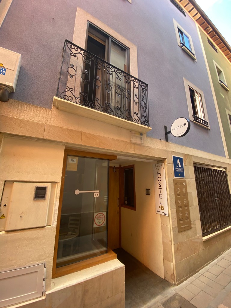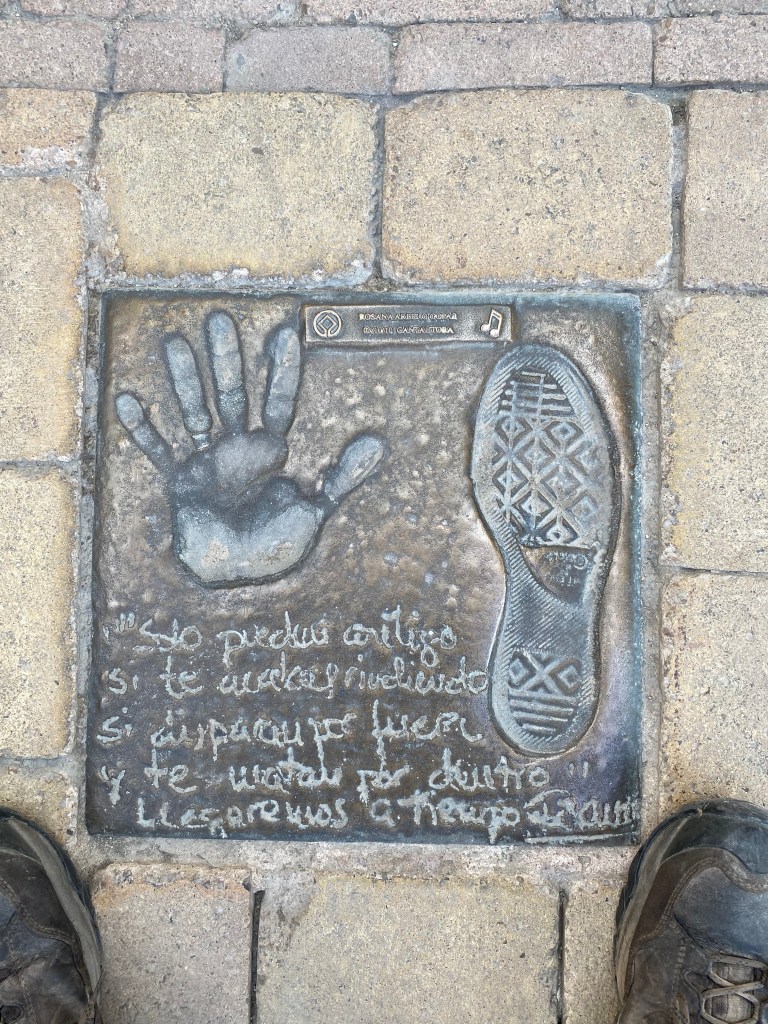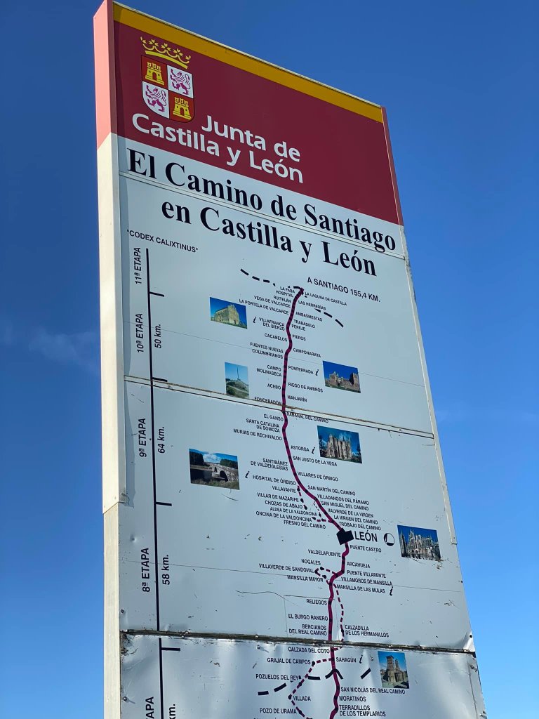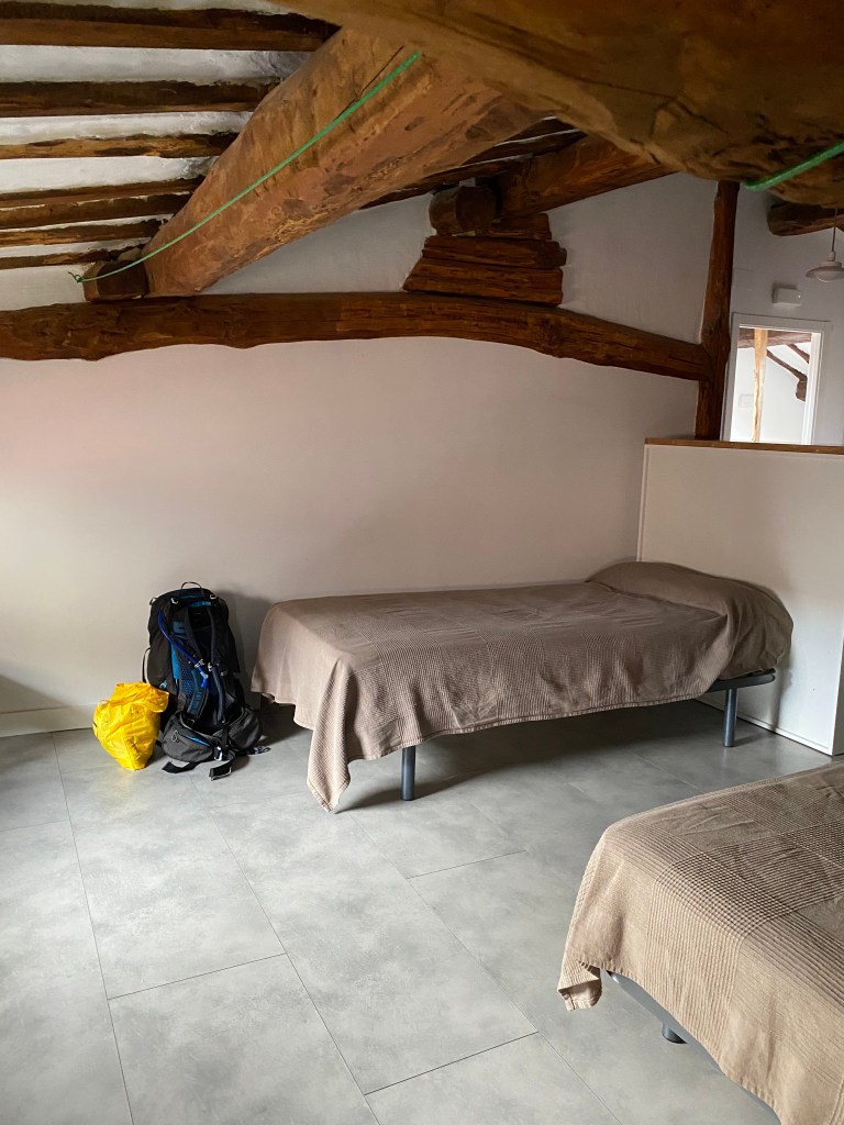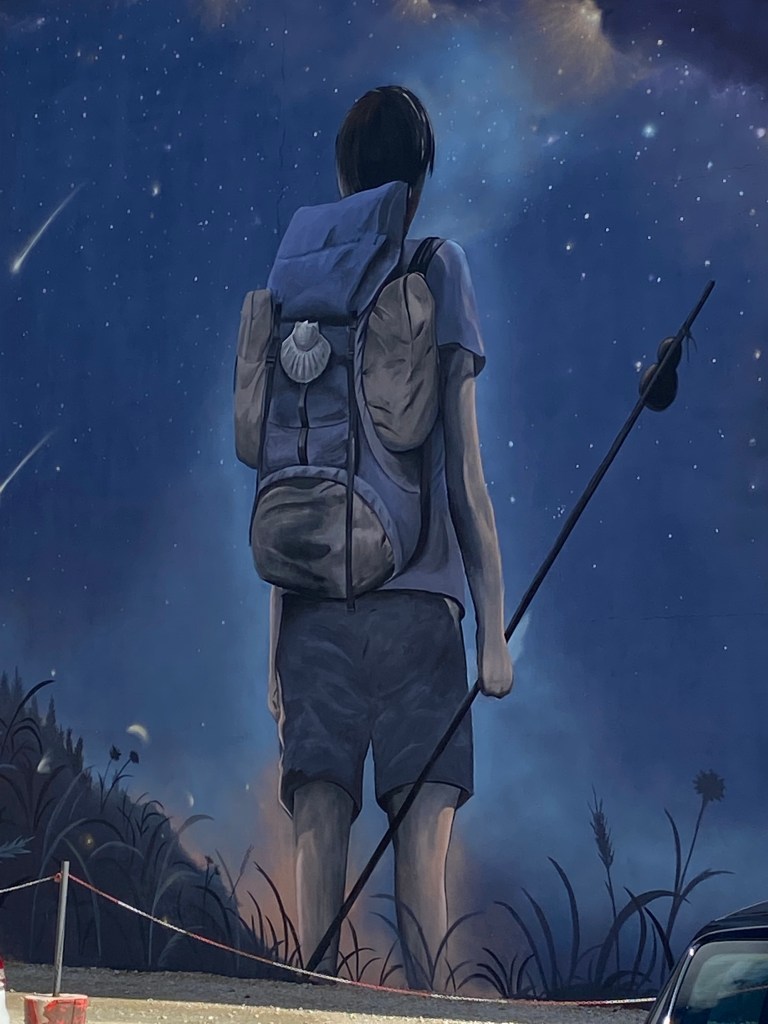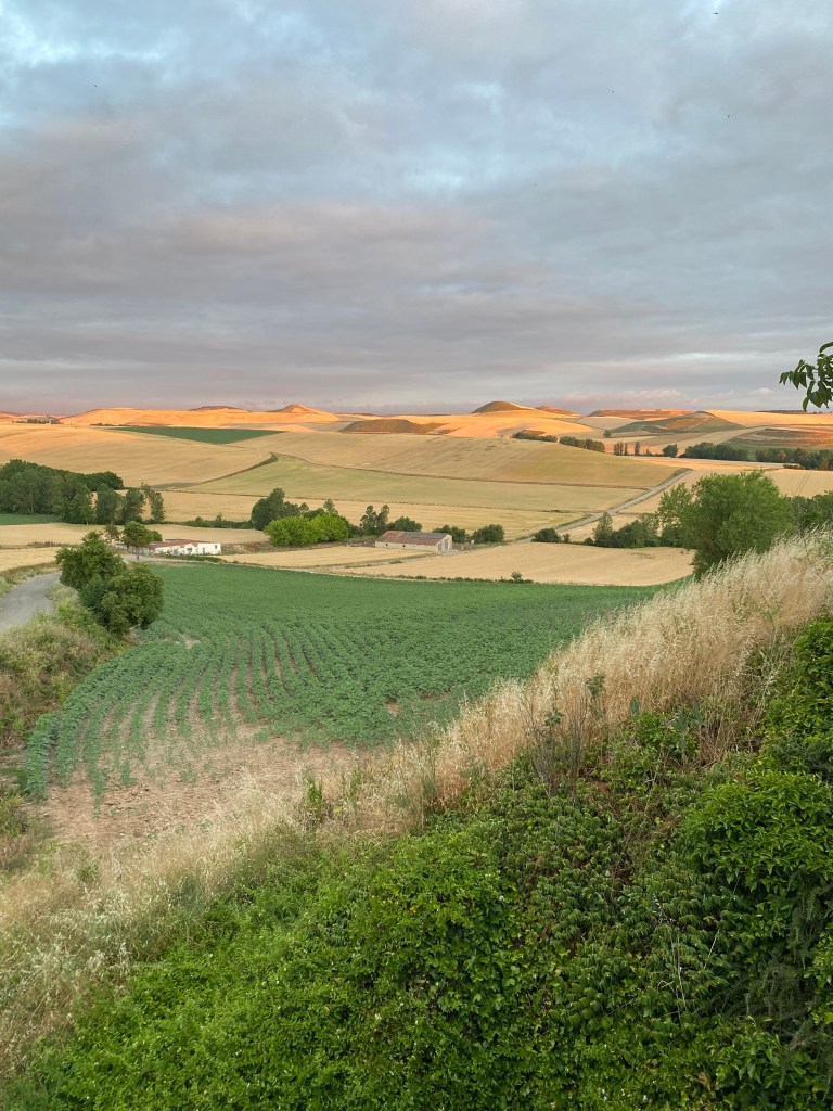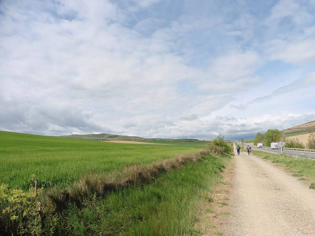 Vendredi 24 juin, je m’empressèrent de quitter les lieux, destination Belorado. Avant de quitter Grañón, je profite d’un beau point de vue sur la campagne environnante. Après quelques kilomètres, des panneaux annoncent que j’entre dans la communauté autonome de Castille-et-León et plus précisément dans la province de Burgos. Pour le reste du trajet quelques pentes modérées et des petits raidillons. Je fais les 19 kilomètres pratiquement d’une traite ; difficile de partager le plaisir de marcher. En entrant dans Belorado, je remarque la présence au sol d’une dalle de bronze sur lesquelles figurent deux empreintes : l’une de pas, symbolisant la semelle du pèlerin ; l’autre une main, signe de bienvenue et d’hospitalité des habitants. Pour me rétablir de la veille, j’ai réservé une chambre à l’hôtel B. Arrivé tôt je vais avoir le temps, de faire ma petite lessive, de déjeuner et de me reposer. Je partage la chambre avec une américaine de Chicago. Dîner au restaurant et il est vite 21 heures, l’heure de rejoindre le dortoir pour une nuit de récupération indispensable.