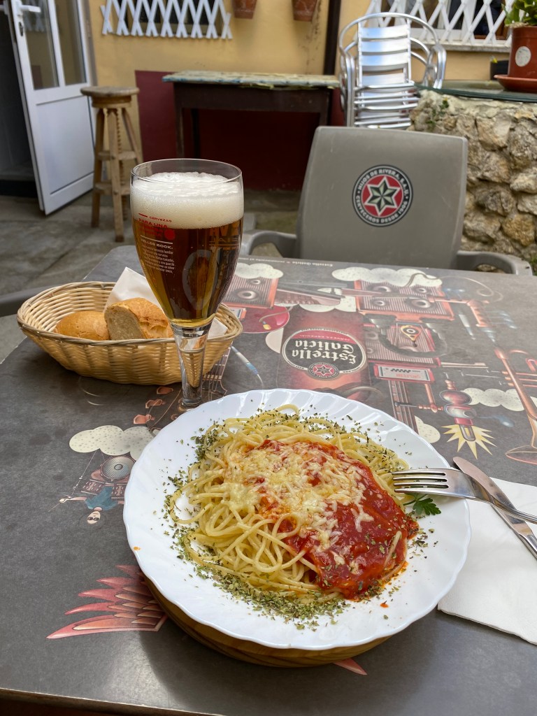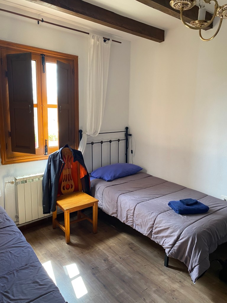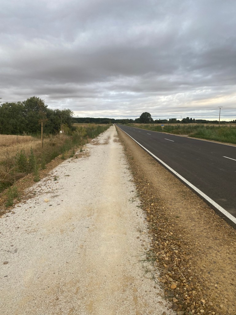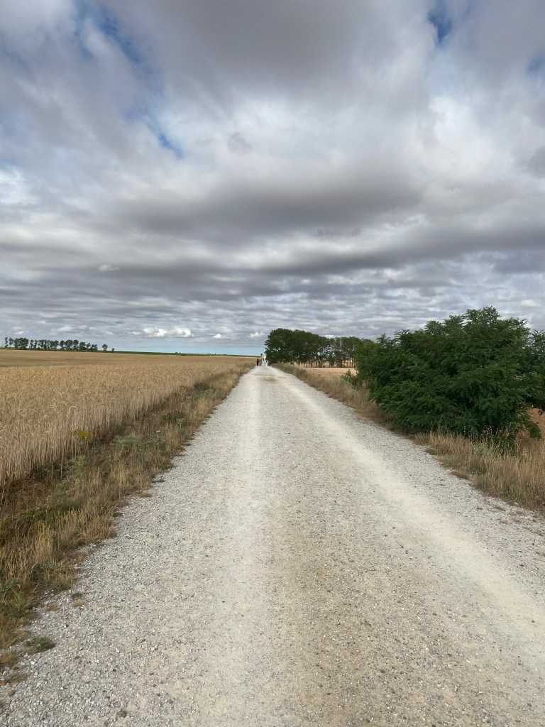 Jeudi 30 juin, pour mon quarantième jour de marche le chemin me conduit à Calzadilla de la Cueza. Les premiers kilomètres se font sur la route. À peine le temps de démarrer de Villalcázar de Sirga avec d’un côté le coucher de lune et de l’autre le lever de soleil, que j’arrive à Carrión de los Condes pour la pause tortilla et café con leche. Après cette halte, je m’engage sur un tracé tiré au cordeau, presque plat, aux interminables lignes droites, qui évolue entre des champs de céréales et quelques parties boisées. C’est incroyable de marcher pendant près de deux heures sans une seule courbe, toujours droit devant. Ce tronçon monotone de plus de 17 km sans variation de paysage et sans aucun village est le plus long de tout le Chemin Français. Il n’y a pas âme qui vive, sauf les pèlerins. Cette étape de 23 km m’aura permis de me mettre à l’écoute de moi-même. Dans le lointain, je devine un clocher, puis peu à peu, Calzadilla de la Cueza apparaît devant moi. Je trouve à me loger à l’albergue los Canarios. Pour le dîner, j’opte pour le menu du pèlerin, soit très peu de choix à petit prix.