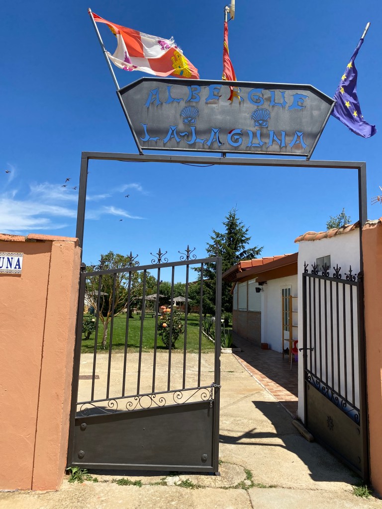 Samedi 2 juillet, ce jour courte étape de transition pour rallier El Burgo Ranero à 18 km. Je pars aux premières lueurs de l’aube, la température est idéale pour marcher. A un rythme calme mais toujours constant, j’avance jusqu’à Bercianos del Real Camino où une petite pause s’impose. Les kilomètres suivants la solitude est de retour sur un chemin bordé d’arbres longeant une ancienne route secondaire. La monotonie des jours précédents s’installent. Rien d’intéressant à voir. Pour la première fois depuis le début de mon chemin, j‘écoute de la musique en marchant. Il faut dire que la chaleur associée à ces lignes droites, ont eu raison de ma bonne humeur. A 13 heures, j’atteint finalement la fin de l’étape. Ici les jeunes platanes ne sont pas nus. Pendant les mois de confinement, des femmes ont consacré leur temps à confectionner au crochet des patchworks pour décorer des arbres du village. Arrivée à l’albergue La Laguna, comme tous les jours, douche, lessive, repos, dîner avec les compagnons du chemin.