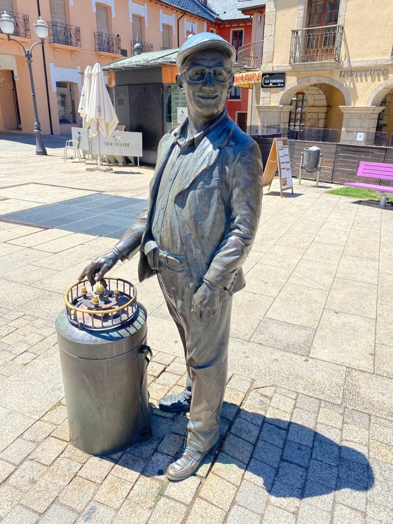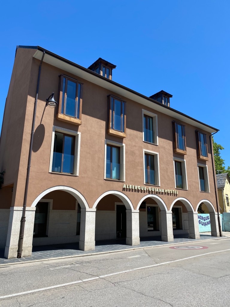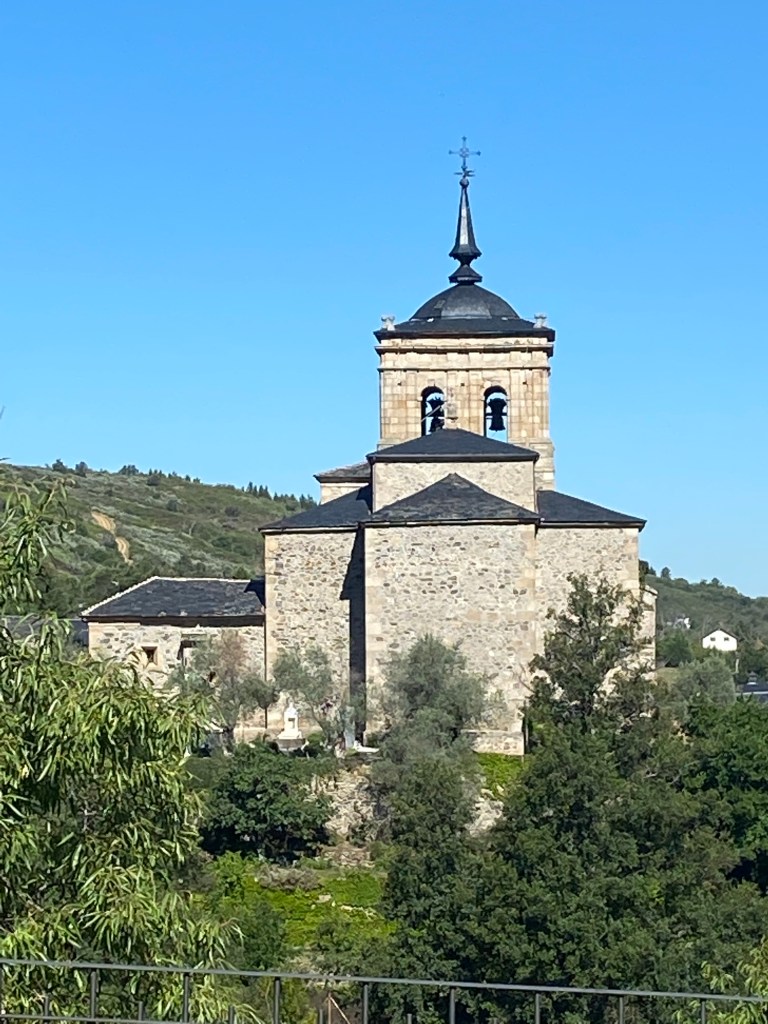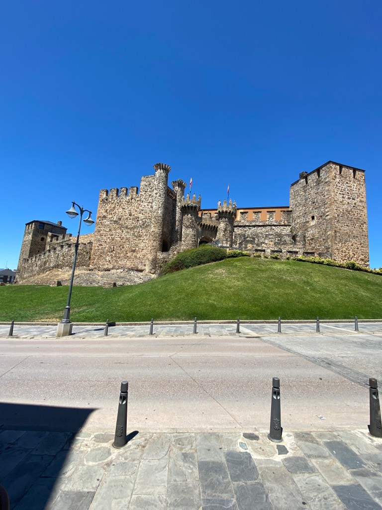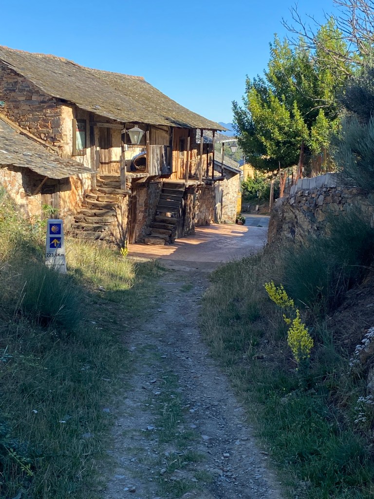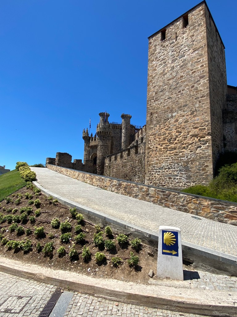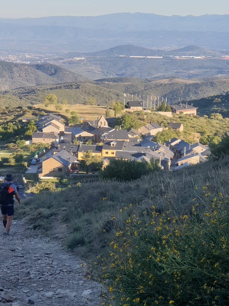 Vendredi 8 juillet, j’ai passé une bonne nuit malgré la promiscuité dans le dortoir. Je me lève tôt vers 4 heures car l’étape d’aujourd’hui est longue, 28 km et j’aimerais bien être à la Cruz de Ferro (Croix de Fer) pour le lever de soleil. Selon une tradition bien ancrée depuis la nuit des temps, les pèlerins viennent y déposer une pierre pour se débarrasser symboliquement de leur fardeau. Ici pas d’éclairage public, il fait nuit noire et pas l’ombre d’une flèche directionnelle. J’avance avec ma lampe frontale, ça grimpe un peu. Le chemin débouche sur une petite route. Dans le lointain, je distingue la croix, le jour est en train de se lever ! Le monticule est énorme, peut-être 5 mètres de haut, telle une pyramide. Grand moment d’émotion, mon souhait était de venir déposer ici mes cailloux avec le message qu’il transporte en eux, et j’y suis ! Je dépose mon sac à dos et sort mon offrande. Les yeux humides, j’accomplis mon voeux au pied de la croix. Quelques minutes plus tard, je repars le chemin serpente sur une crête avant d’entamer une longue descente vers Ponferrada qu’on voit de très loin avant de s’enfoncer dans les vallons. Le temps est splendide, un ciel azuréen, il faut assurer chacun de ses pas dans la descente pour éviter la chute. Je croise plusieurs villages, tous aussi beaux les uns que les autres, c’est le pays de la pierre et de l’ardoise. Retour sur le bitume jusqu’au lieu d’étape Ponferrada. Mon albergue Guiana très moderne, quasiment futuriste. La ville vaut le détour, beaucoup de choses à voir, dont le château des templiers.