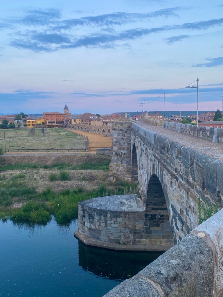 Mercredi 6 juillet, aujourd’hui étape de 25 km pour rejoindre Astorga. Depuis deux jours je ressens une douleur au mollet gauche probablement les premiers symptômes d’une contracture. Ce matin j’ai donc adopté un pas de sénateur. L’étape n’est pas très longue, il n’y a donc pas le feu. Ce début de chemin suit le même schéma qu’hier en parallèle de la route, sans intérêt particulier. Je quitte enfin la route et arrive au village médiéval d’Hospital de Orbigo. Pause café dans une auberge avec vue sur un pont grandiose. Les jours se suivent, mais ne se ressemblent pas. Après d’interminables jours de plaine je marche sur un terrain très agréable et légèrement vallonné. Après avoir traversé une passerelle horrible, j’arrive à Astorga. Je tombe tout de suite sur l’albergue Siervas de María où je vais séjourner. Après m’être installé et pris ma douche direction le restaurant. Dans l’après-midi, petit tour de la jolie ville romaine pour visiter le palais épiscopal, œuvre de Gaudi et la cathédrale. Sans oublier la pharmacie pour l’achat d’une pommade anti-inflammatoire et d’une orthèse.