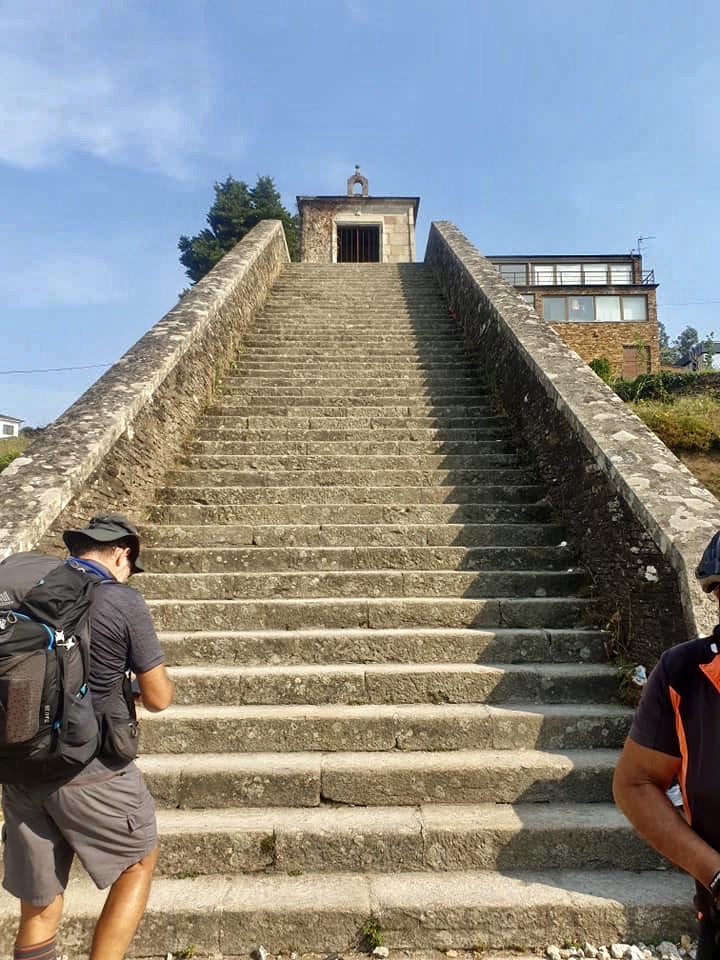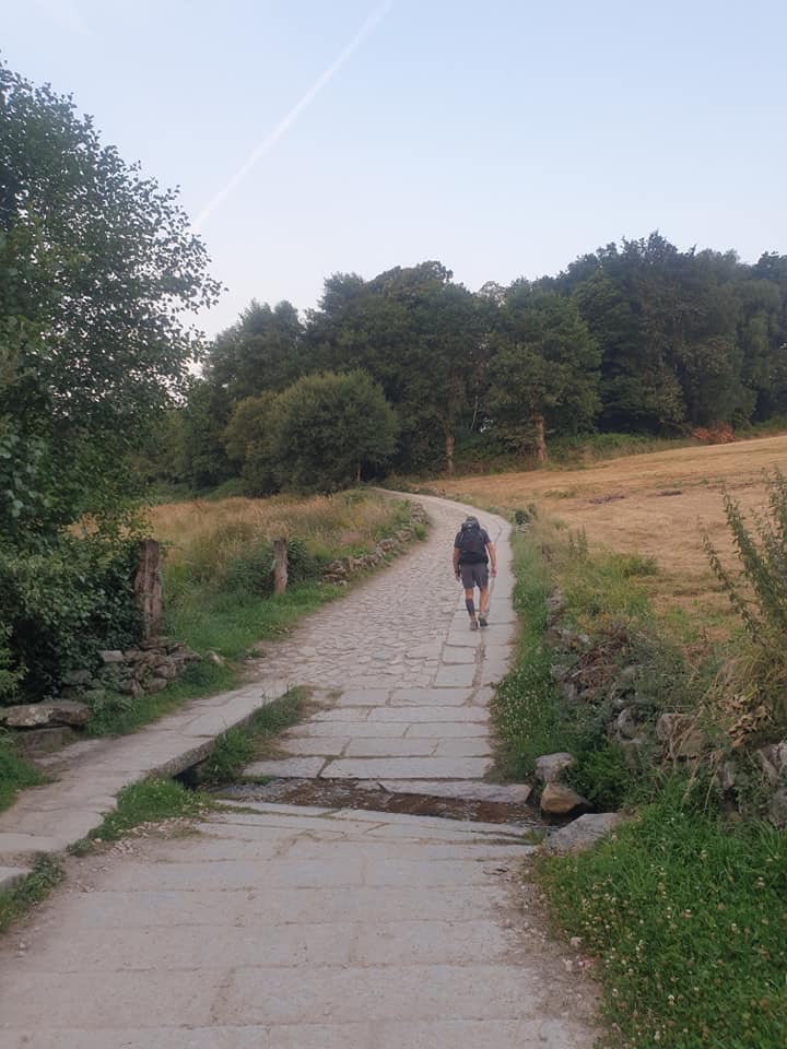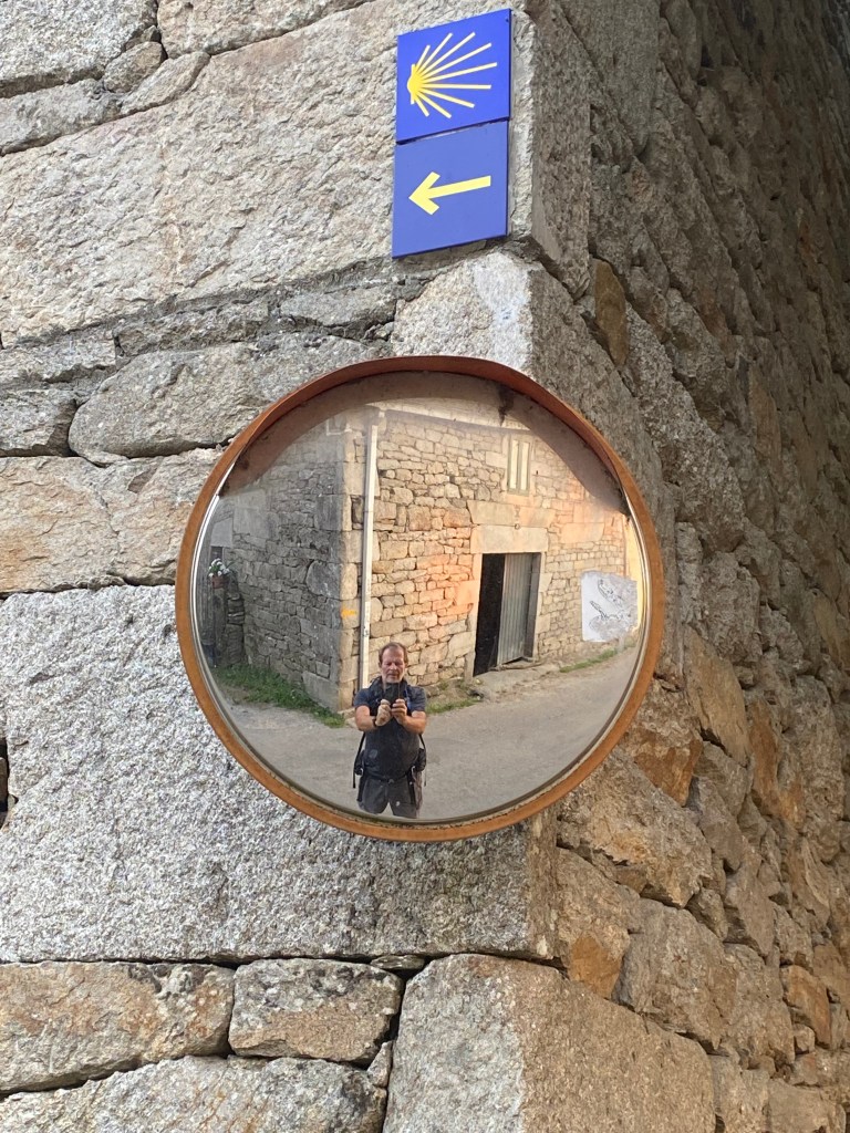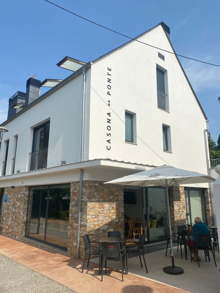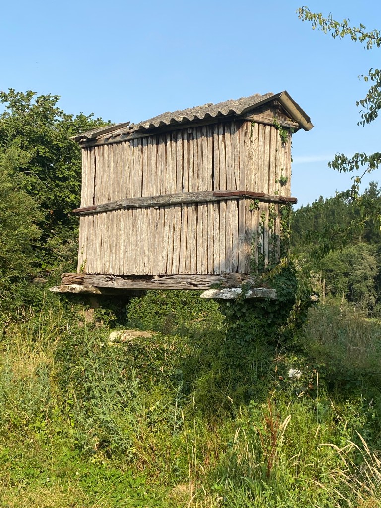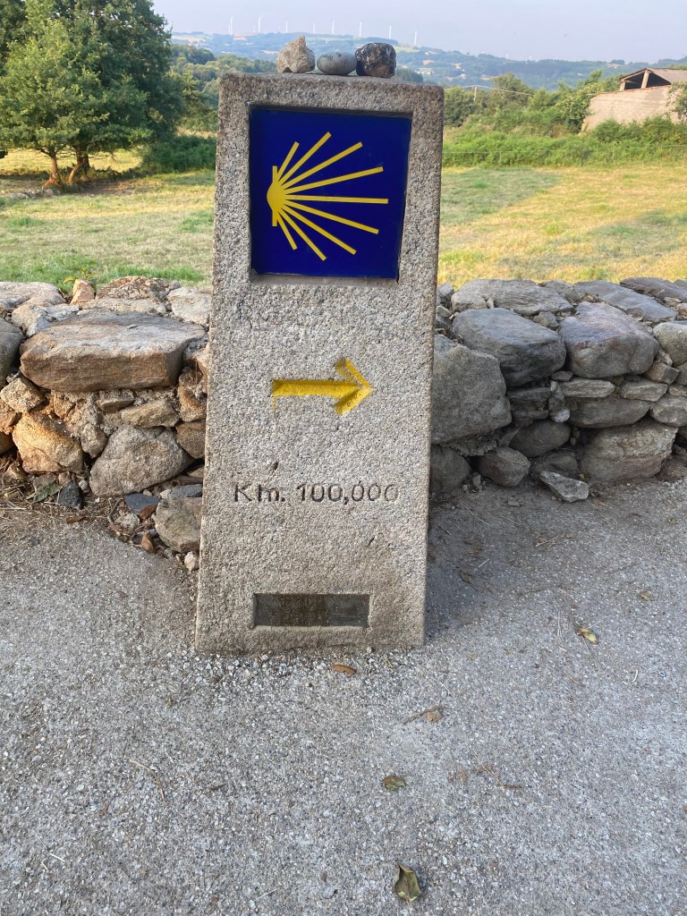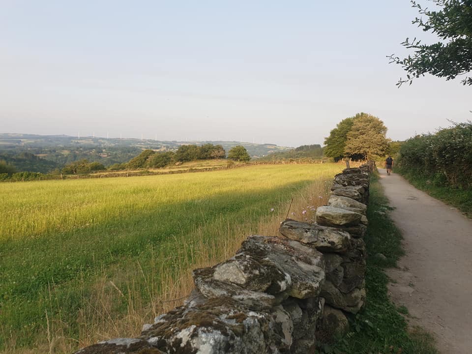 Mercredi 13 juillet, au programme de cette étape de 23 km, des côtes et descentes fréquentes. La mise en jambe se fait par une belle montée. Après avoir franchi une ligne de chemin de fer, je chemine au cœur de la Galice rural : forêts profondes de chênes et de châtaigniers, chemins et champs de pâturages bordés de murets, petit hameaux. Sans oublier les greniers galiciens nécessaires au stockage du maïs après sa récolte. C’est vraiment une très belle étape avec peu de bitume. Après la traditionnelle pause café, c’est reparti pour rejoindre un endroit symbolique du chemin : la borne indiquant les 100 derniers kilomètres à parcourir pour arriver à Santiago, la photo s’impose bien évidemment. Le but se rapproche à chaque pas. Plus que 5 km par des chemins creux bordés de pierres avant d’arriver à Portomarin. Je franchis le pont construit sur la ville médiévale engloutie sous les eaux d’un barage. A 11 heures, je m’installe à l’albergue Casona da Ponte réservée hier soir. Petit rituel, une bière avec Jean-Claude pour nos derniers jours, car nous sentons la fin arriver à grand pas et l’émotion avec.