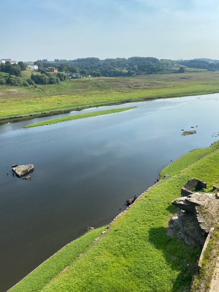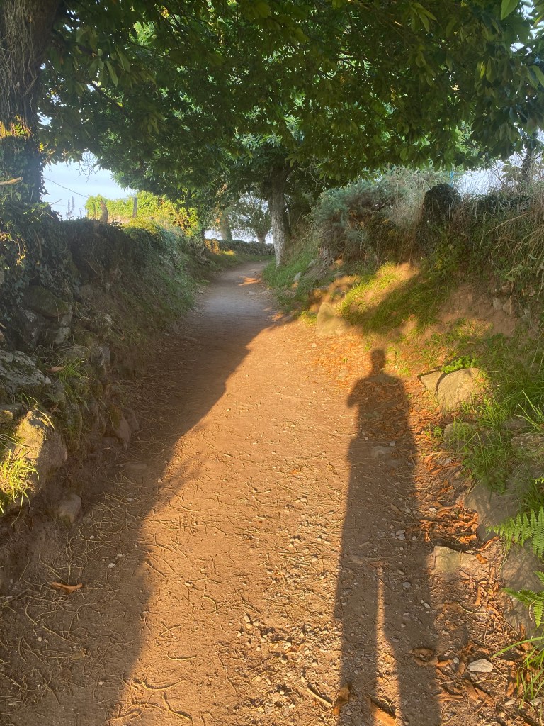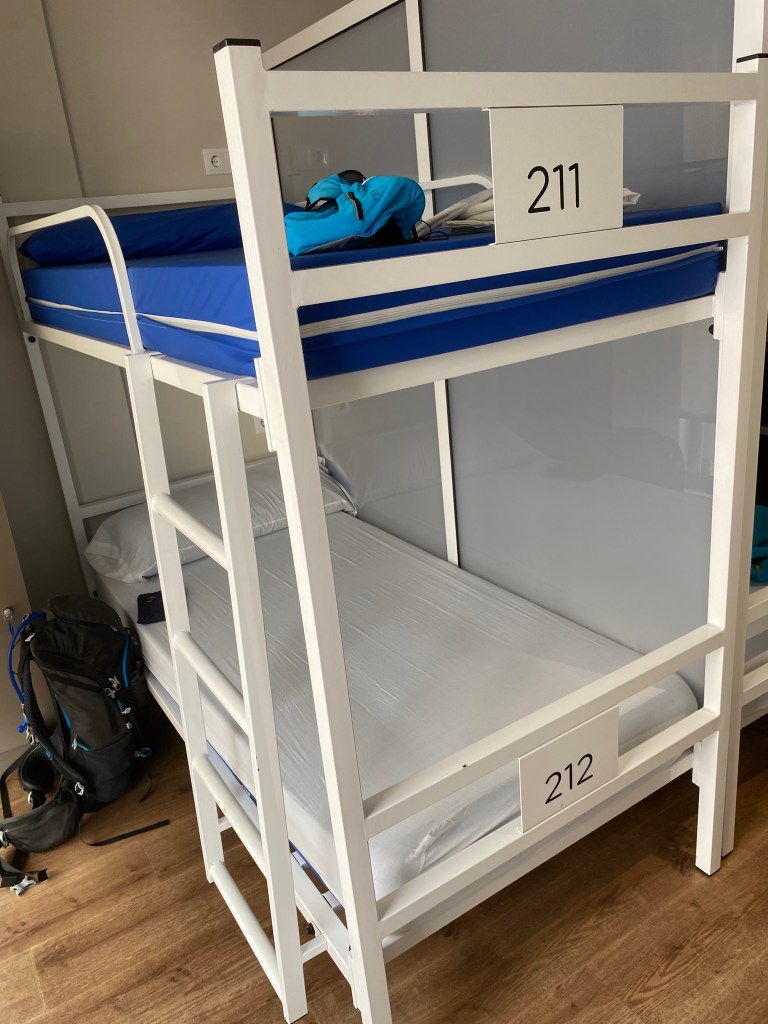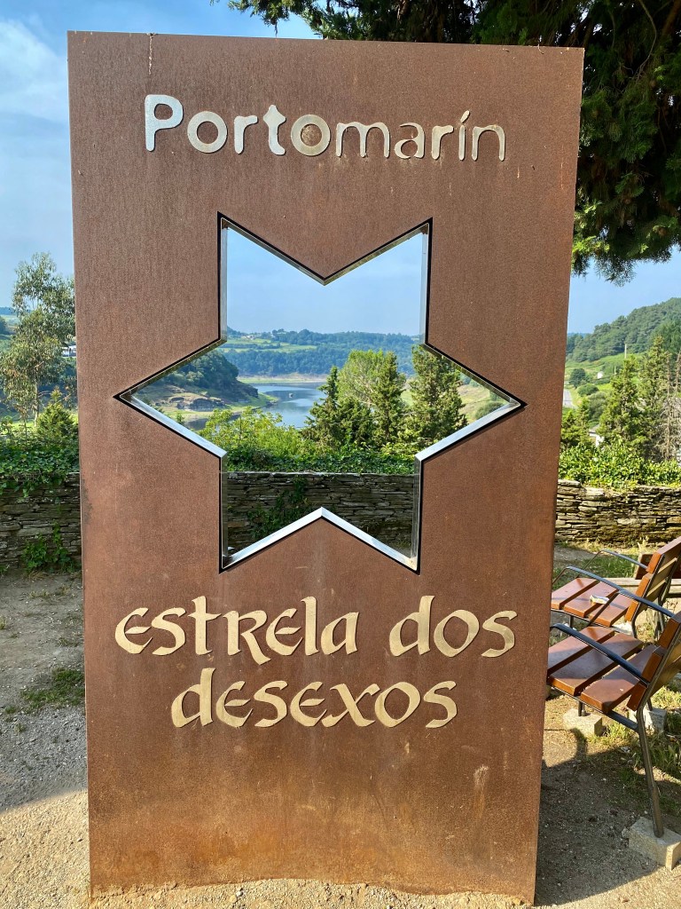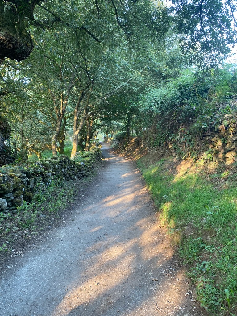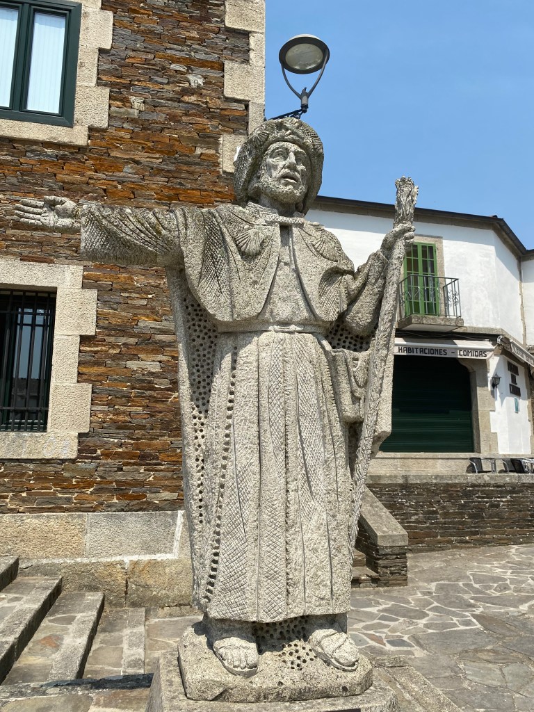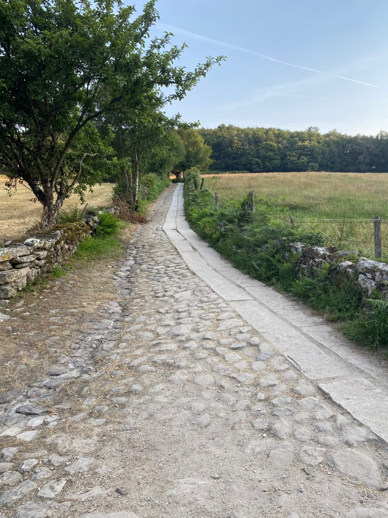 Mercredi 13 juillet, au programme de cette étape de 23 km, des côtes et descentes fréquentes. La mise en jambe se fait par une belle montée. Après avoir franchi une ligne de chemin de fer, je chemine au cœur de la Galice rural : forêts profondes de chênes et de châtaigniers, chemins et champs de pâturages bordés de murets, petit hameaux. Sans oublier les greniers galiciens nécessaires au stockage du maïs après sa récolte. C’est vraiment une très belle étape avec peu de bitume. Après la traditionnelle pause café, c’est reparti pour rejoindre un endroit symbolique du chemin : la borne indiquant les 100 derniers kilomètres à parcourir pour arriver à Santiago, la photo s’impose bien évidemment. Le but se rapproche à chaque pas. Plus que 5 km par des chemins creux bordés de pierres avant d’arriver à Portomarin. Je franchis le pont construit sur la ville médiévale engloutie sous les eaux d’un barage. A 11 heures, je m’installe à l’albergue Casona da Ponte réservée hier soir. Petit rituel, une bière avec Jean-Claude pour nos derniers jours, car nous sentons la fin arriver à grand pas et l’émotion avec.