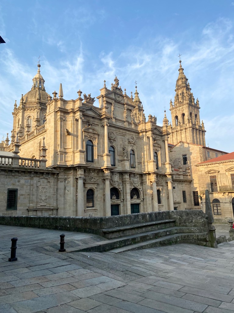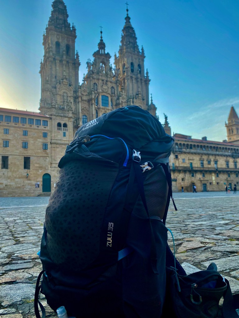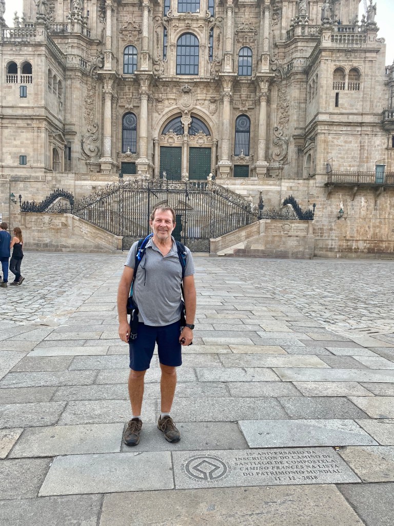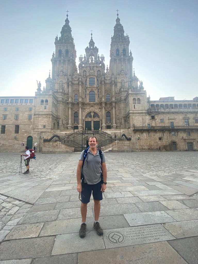 Dimanche 17 juillet, c’est un grand jour, je me lève très tôt un peu avant 4 heures. La nuit a été courte, sans doute l’excitation d’en finir. Me voici donc en marche pour cette ultime étape, il fait nuit noire. Qu’il est agréable de marcher ainsi, seul dans l’obscurité au coeur des dernières forêts d’eucalyptus. Je garde un bon rythme, je suis perdu dans mes pensées qui déroulent le film de tout ce que j’ai vécu sur le chemin. Heureux moment de vie où j’ai pu apprécier l’instant présent et mettre à profit ce moment privilégié que de me retrouver face à moi-même. Je savoure chaque pas, et chaque paysage qui me rapproche vers mon but. Après le vacarme des pistes de l’aéroport, passage à Lavacolla, au nom évocateur. La tradition voulait que le pèlerin se lave intégralement avant l’entrée dans la ville sainte de Santiago. Quelques rares marcheurs à cette heure-ci. Peu avant Santiago, le chemin grimpe le Monte do Gozo, d’où un panorama sur la ville s’offre à moi. Puis c’est la descente vers Santiago et ses faubourgs. C’est une grande ville, le centre historique est encore loin. L’arrivée est assez spéciale, car à aucun moment, quand on rentre dans la ville, on aperçoit la cathédrale. Plus je m’en approche, plus il y a de monde, pèlerins, touristes ça grouille. Rien ne peut contenir mon entrée triomphale, en musique au son de la gaïta, sur cette place Obradoiro. Vers 9 heures, ça y est après 22 km j’y suis, je l’ai fait. Je retire mon fidèle sac dos, je m’assois, la cathédrale, vers laquelle j’ai marché ces 2 derniers mois, se dresse devant moi ! Pas facile de décrire cet instant, plein d’émotions, je prends conscience que c’est fini et que c’est bien ici que se termine mon pèlerinage. J’appelle ma moitié pour partager l’instant. Parti du Puy-en-Velay le 20 mai et puis 57 jours et 1 515 km plus tard me voici à Saint-Jacques-de-Compostelle. Tout c’est passé si vite, signe des biens-faits du chemin. Je suis fier de ce que j’ai accompli, cela n’a pas été simple tous les jours loin de là. Néanmoins ce n’est pas un exploit extraordinaire, il est à la porter de tous. Je retrouve Jean-Claude qui arrive à son tour et d’autres pèlerins, on se salue, se félicite et on se sépare dans cette atmosphère du pèlerinage.