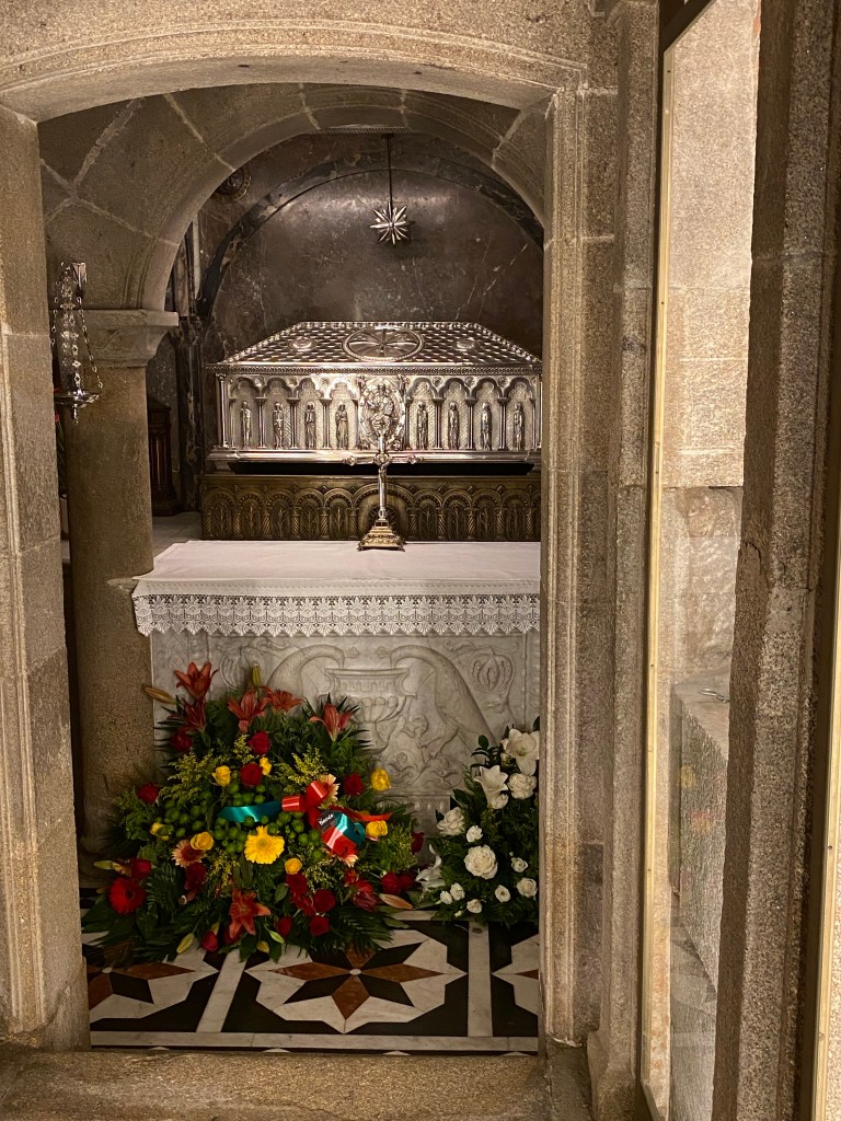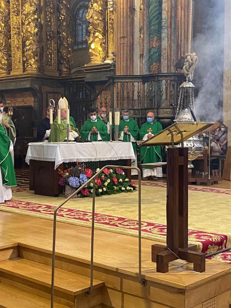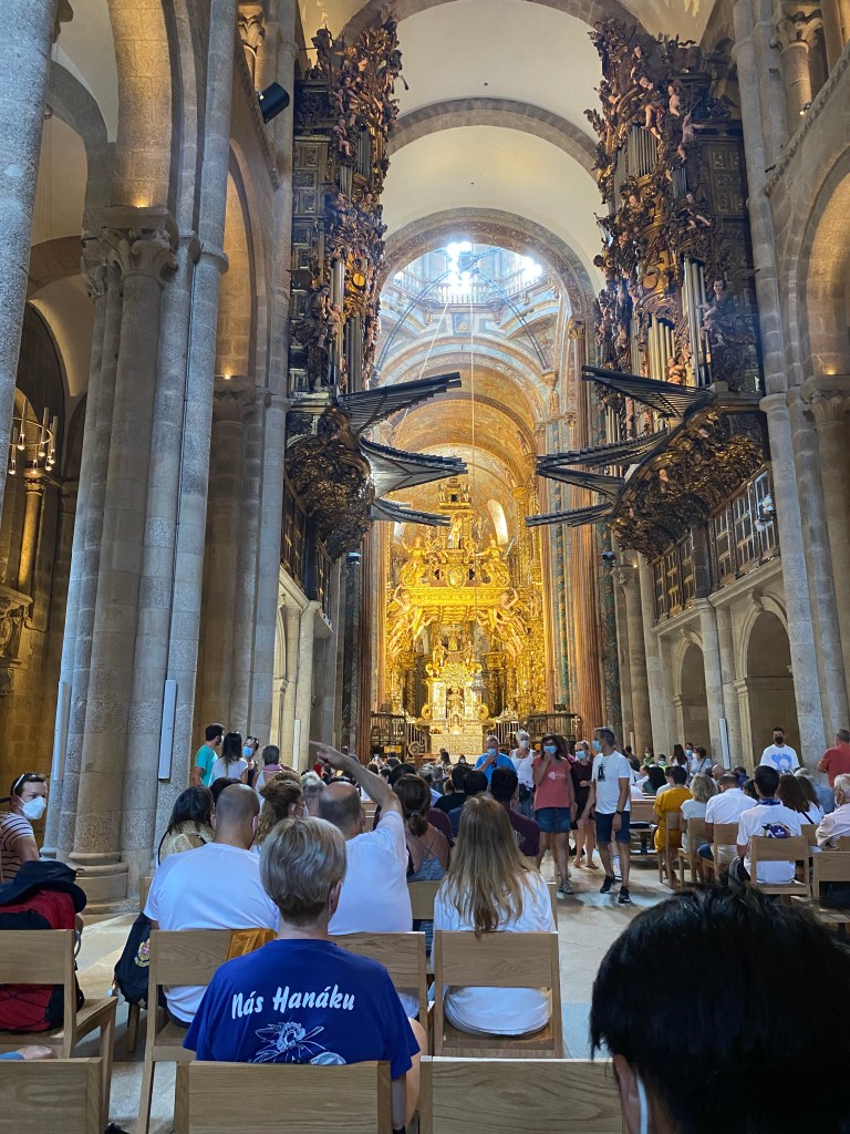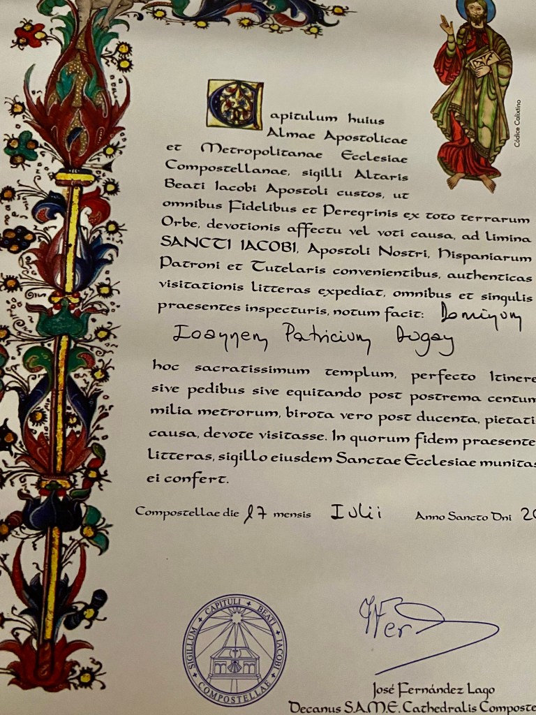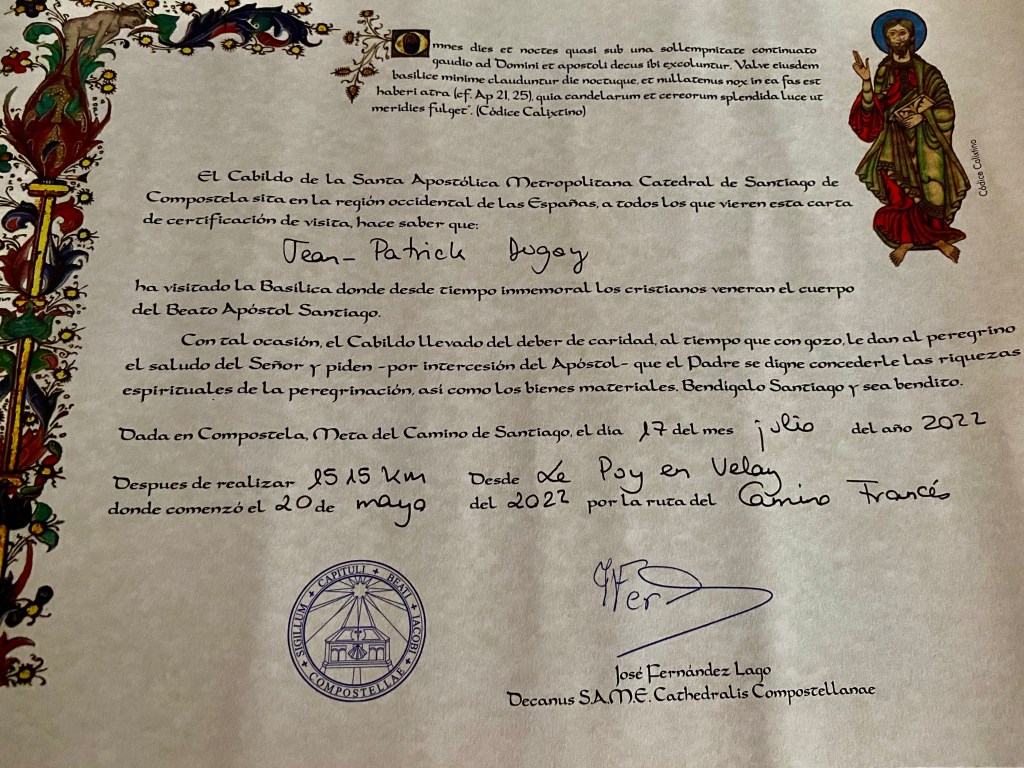 Je me rends au bureau des pèlerins situé à quelques encablures de la Place Obradoiro. L’attente est longue. Sur présentation de ma crédencial, on me délivre un diplôme, en latin, et pour la modique somme de 8 €, j’en reçois un second, en espagnol, attestant les 1 515 km parcourus. Entre quelques courses et un moment d’attente, je contourne la cathédrale et les quatre places qui l’entourent et je croise de nombreux visages connus sur le chemin. A 12 heures, j’assiste à la cathédrale à la bénédiction des pèlerins avec le privilège de voir le fameux botafumeiro en action. Cet énorme encensoir argenté suspendu est balancé au moyen de cordes par sept hommes vêtus de velours aubergine ; un moment impressionnant. Dernier déjeuner avec Jean-Claude car c’est ici que nos chemins se séparent. L’après-midi est consacré à la visite de la cathédrale : ses voûtes, ses sculptures et l’embrassade du buste doré de Saint-Jacques, bien au-dessus de l’autel, dans un décor d’anges en bois doré. Dans la crypte se trouve une urne d’argent. les restes de Saint Jacques. 2022 étant une année jubilaire, l’accès par la porte du Perdon est possible. En début de soirée, je m’installe pour 2 nuits à l’hôtel CampusSur. Demain je n’aurais pas à marcher !