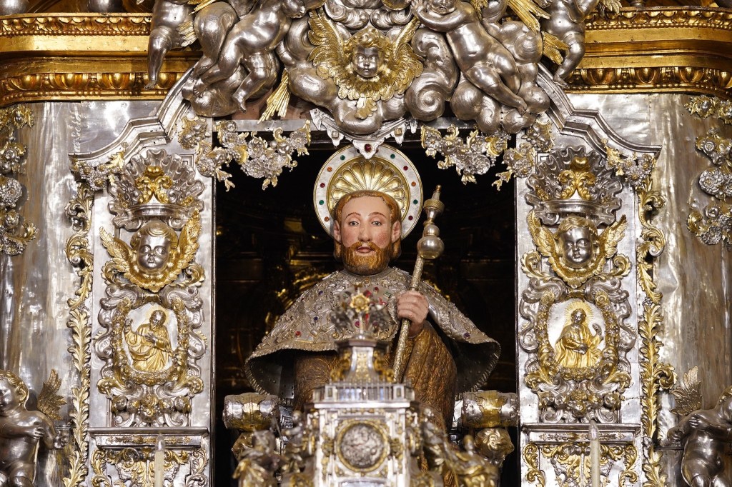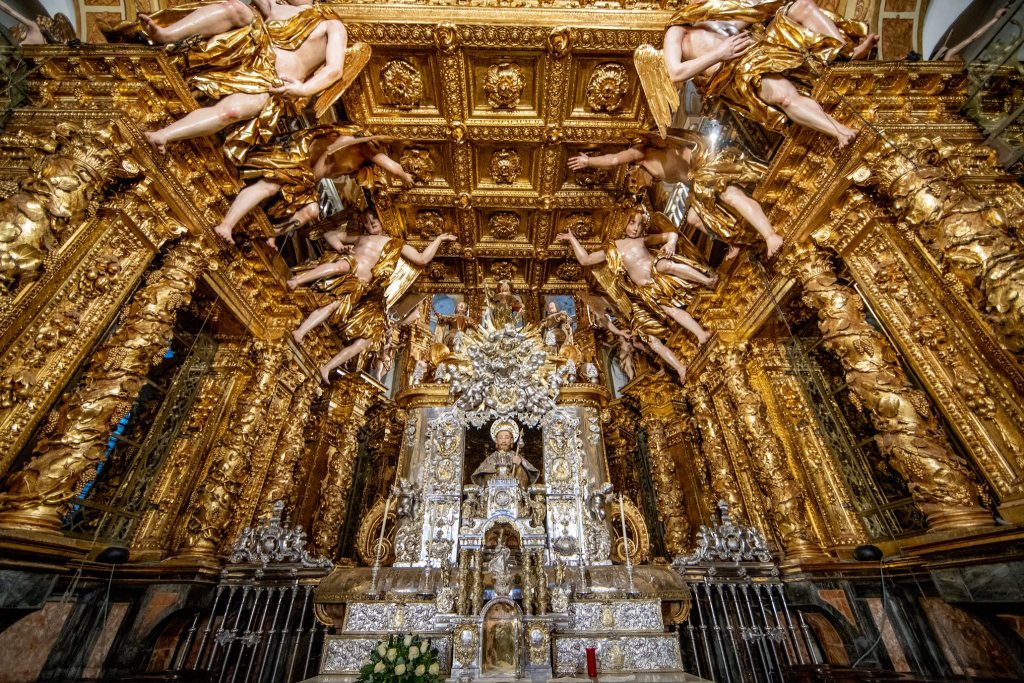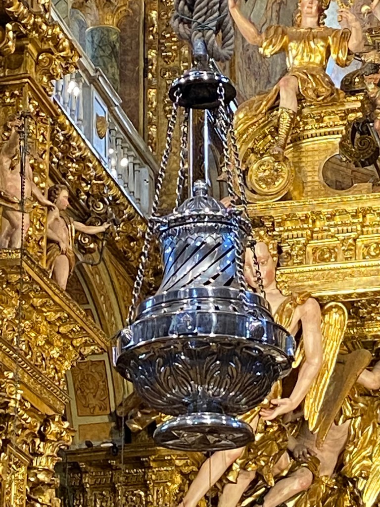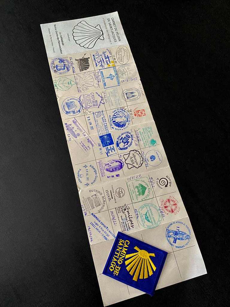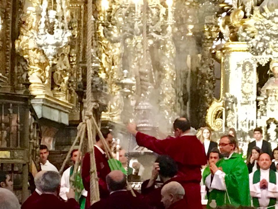 Je me rends au bureau des pèlerins situé à quelques encablures de la Place Obradoiro. L’attente est longue. Sur présentation de ma crédencial, on me délivre un diplôme, en latin, et pour la modique somme de 8 €, j’en reçois un second, en espagnol, attestant les 1 515 km parcourus. Entre quelques courses et un moment d’attente, je contourne la cathédrale et les quatre places qui l’entourent et je croise de nombreux visages connus sur le chemin. A 12 heures, j’assiste à la cathédrale à la bénédiction des pèlerins avec le privilège de voir le fameux botafumeiro en action. Cet énorme encensoir argenté suspendu est balancé au moyen de cordes par sept hommes vêtus de velours aubergine ; un moment impressionnant. Dernier déjeuner avec Jean-Claude car c’est ici que nos chemins se séparent. L’après-midi est consacré à la visite de la cathédrale : ses voûtes, ses sculptures et l’embrassade du buste doré de Saint-Jacques, bien au-dessus de l’autel, dans un décor d’anges en bois doré. Dans la crypte se trouve une urne d’argent. les restes de Saint Jacques. 2022 étant une année jubilaire, l’accès par la porte du Perdon est possible. En début de soirée, je m’installe pour 2 nuits à l’hôtel CampusSur. Demain je n’aurais pas à marcher !