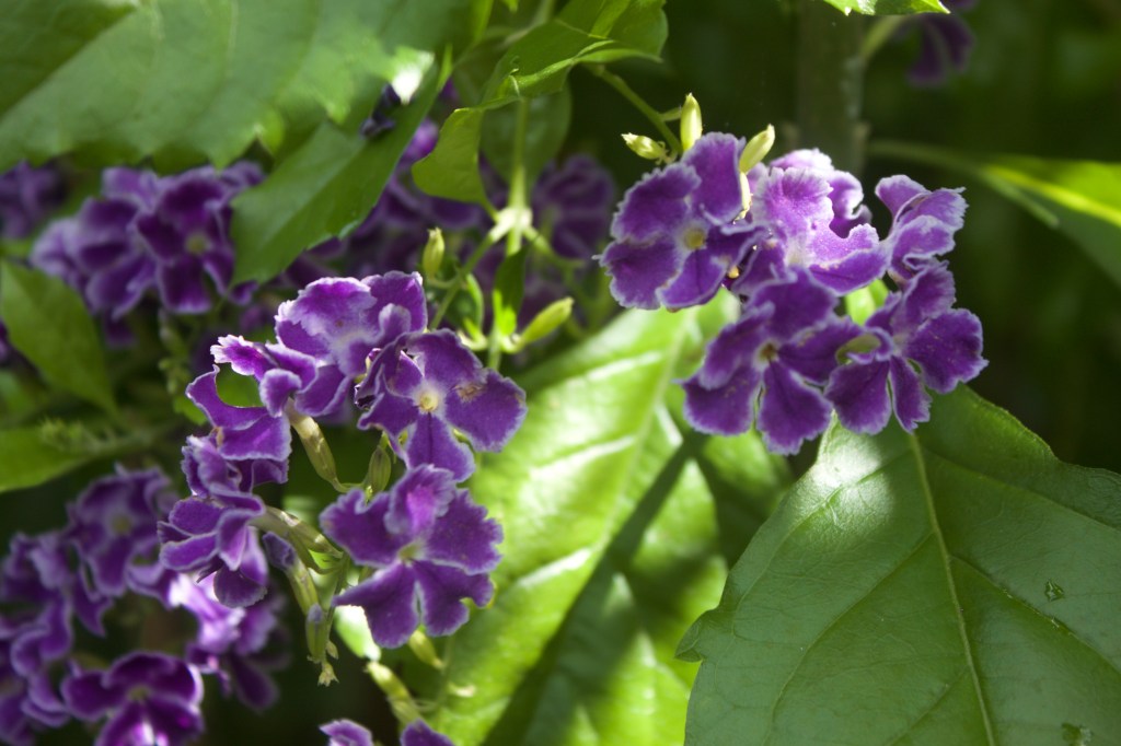 Arbuste persistant, dense et buissonnant. Il arbore un feuillage vert vif tout au long de l’année, sur lequel se détachent de magnifiques grappes de fleurs bleu violet bordées de blanc.