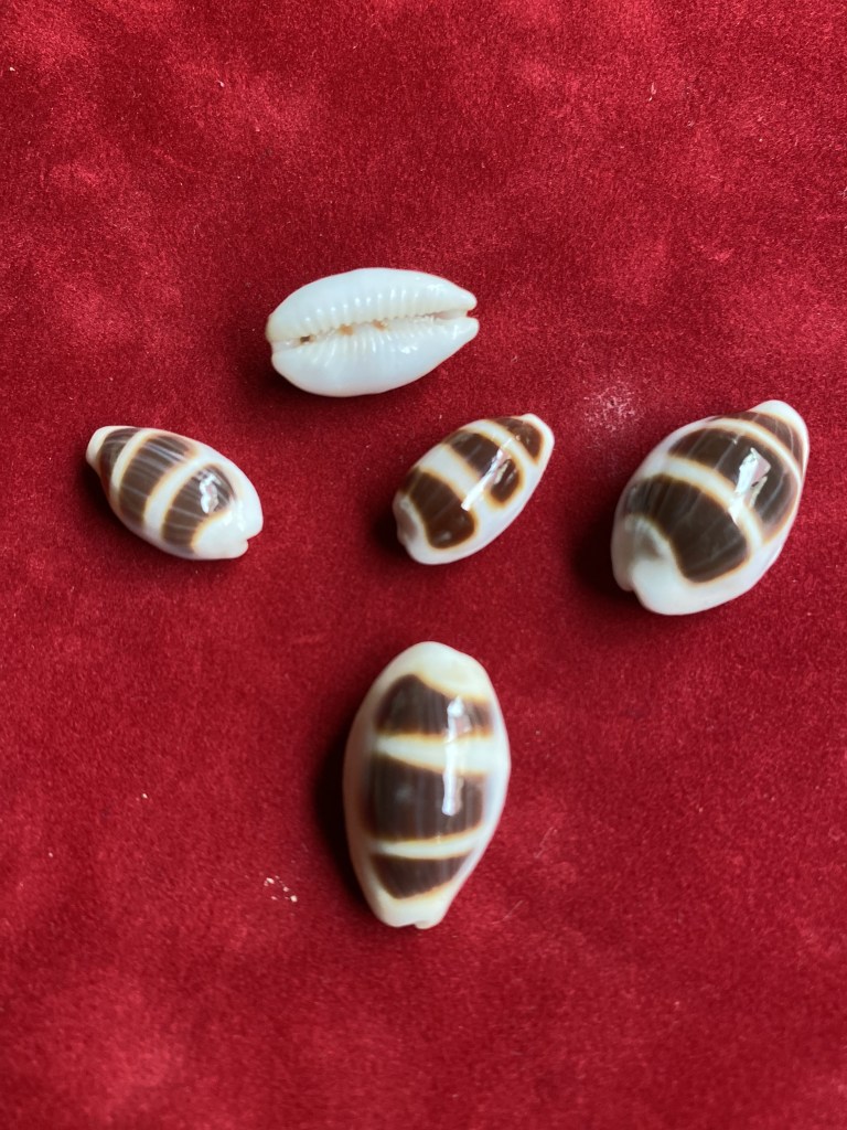 Porcelaine ânon. Fond blanc, trois bandes transversales brunes. Assez commune.