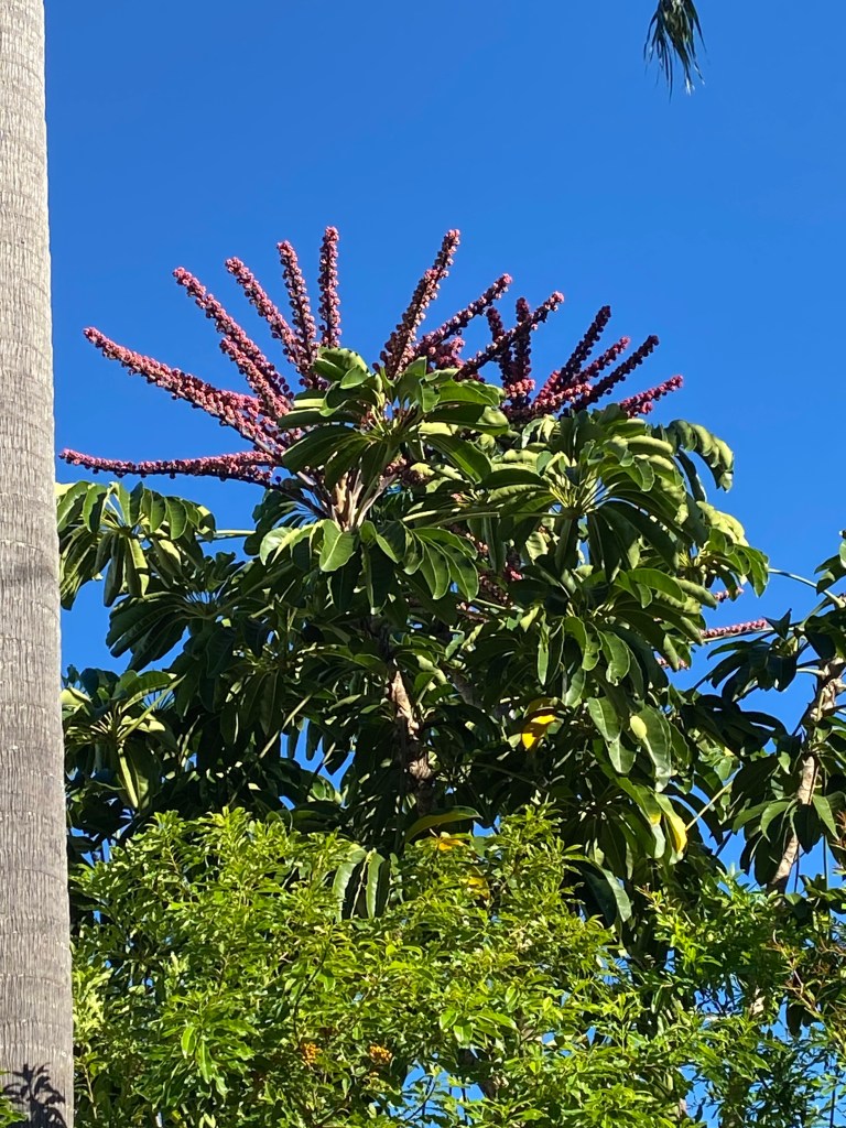 C’est un grand schefflera aux grandes feuilles brillantes. Inflorescences robustes produisant une grande quantité de petites fleurs rouges.