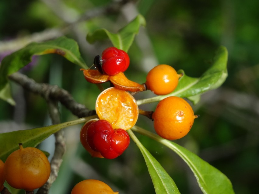 Petit arbuste très ramifié, ses fruits ont inspiré cette appellation locale, les capsules orangées s’ouvrent à maturité sur une perle d’un rouge éclatant composée de graines, évoquant un cœur.