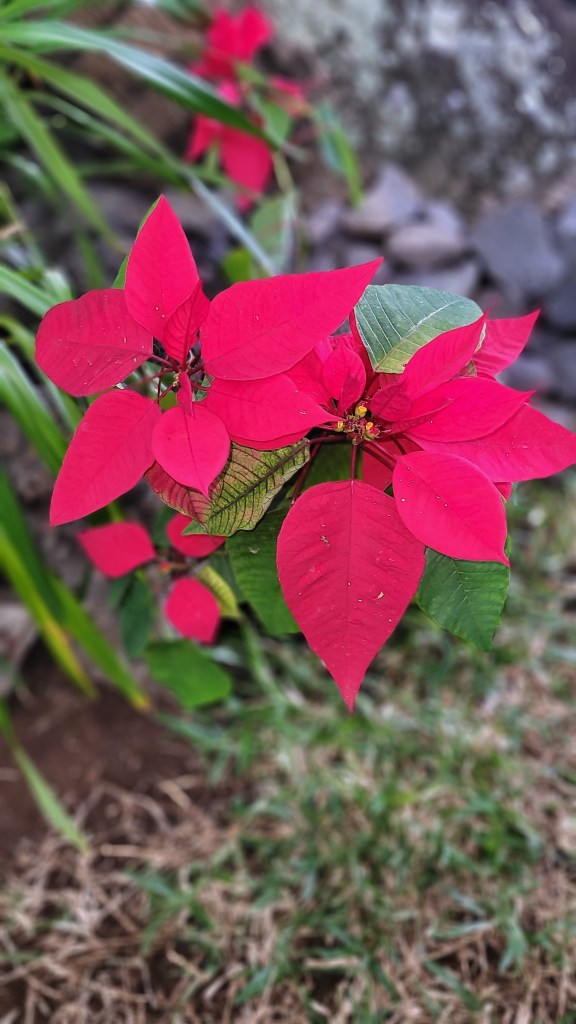 Poinsettia, surnommé étoile de Noël, est une plante ornementale très appréciée à La Réunion pour ses bractées rouges vives qui fleurissent en hiver austral.