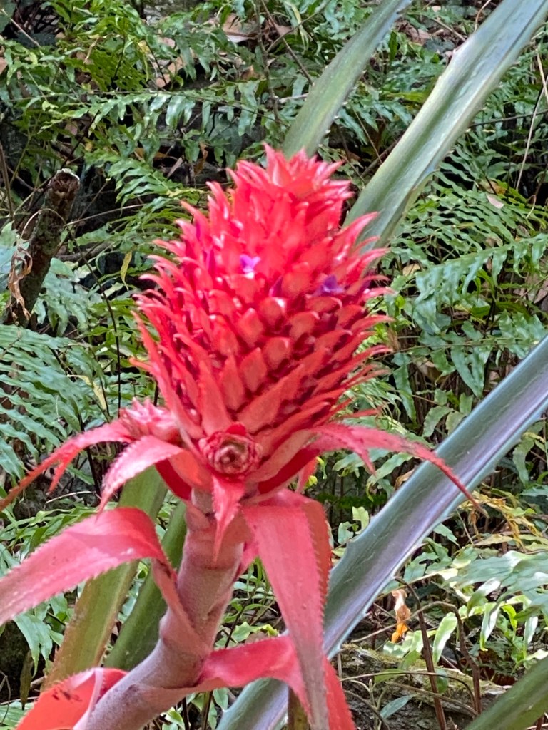 L’ananas comosus variegatus n’est pas un fruit comestible, mais une plante ornementale reconnaissable à son feuillage vert bordé de rouge et surtout à son petit fruit central qui ressemble à un ananas miniature.