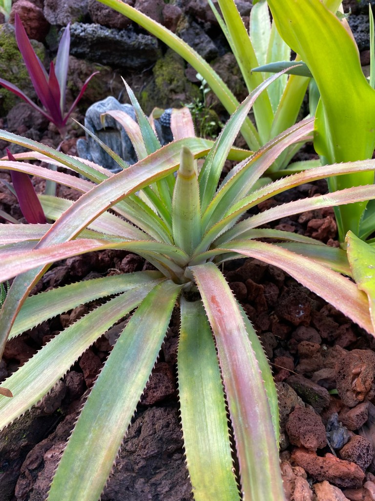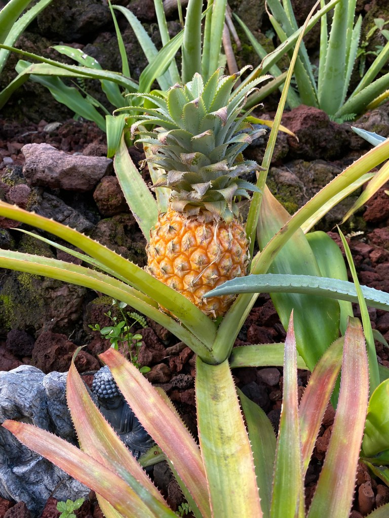 Il doit son nom à la reine Victoria qui l’appréciait beaucoup. L’ananas pousse au sol et donne un fruit unique 12 à 15 mois après sa plantation. D’une rosette de feuilles épineuses naît une inflorescence en épis surmontée d’une couronne de feuilles. Après la floraison, chaque fleur donne son fruit et l’association de tous ces fruits forme l’ananas, les yeux sont les restes désséchés de la fleur.